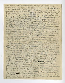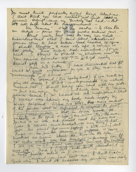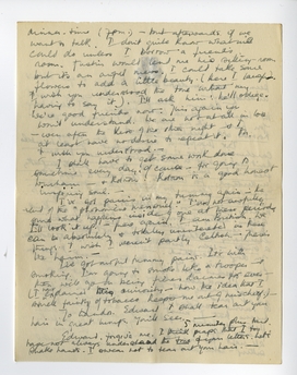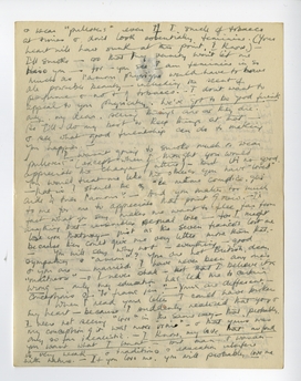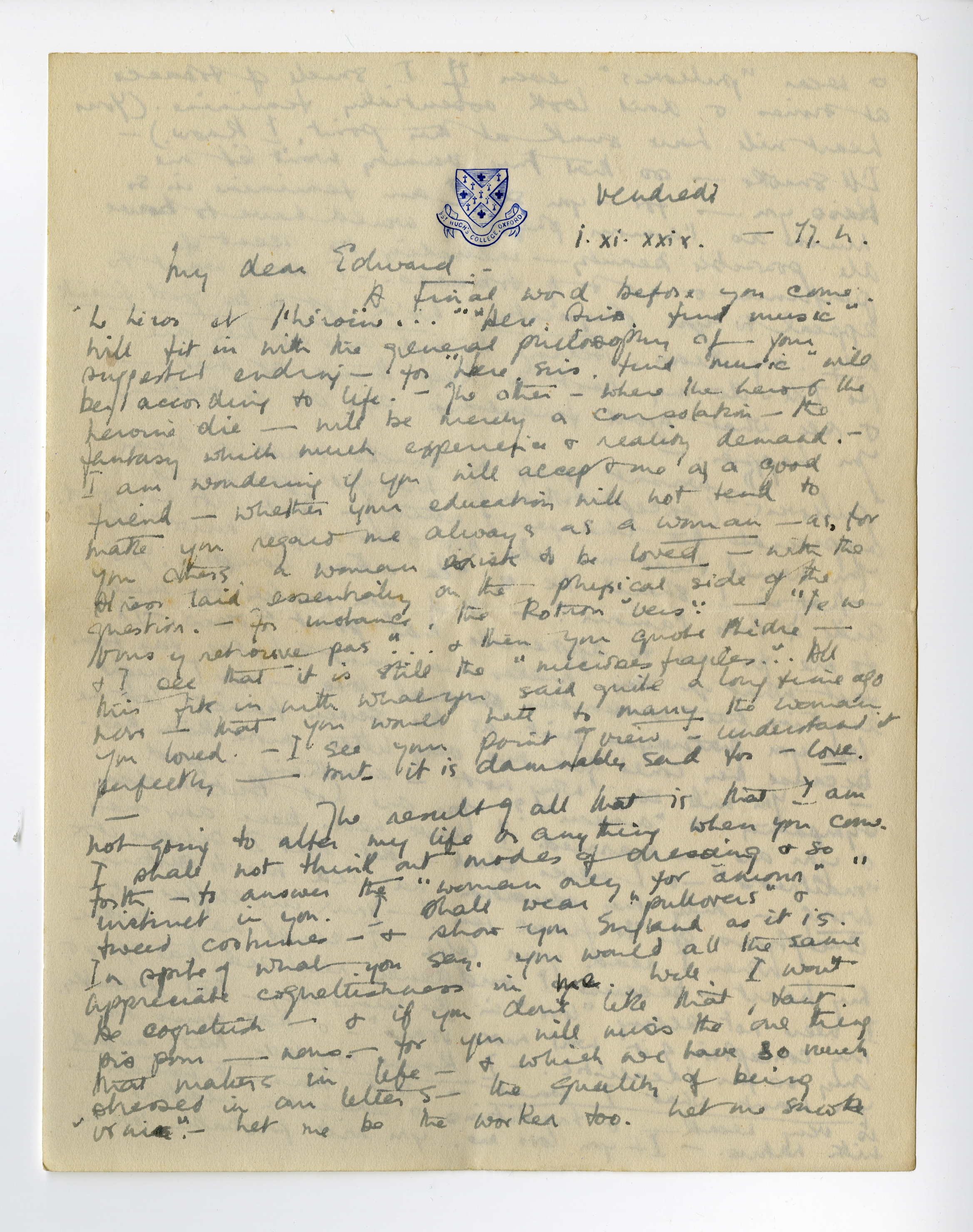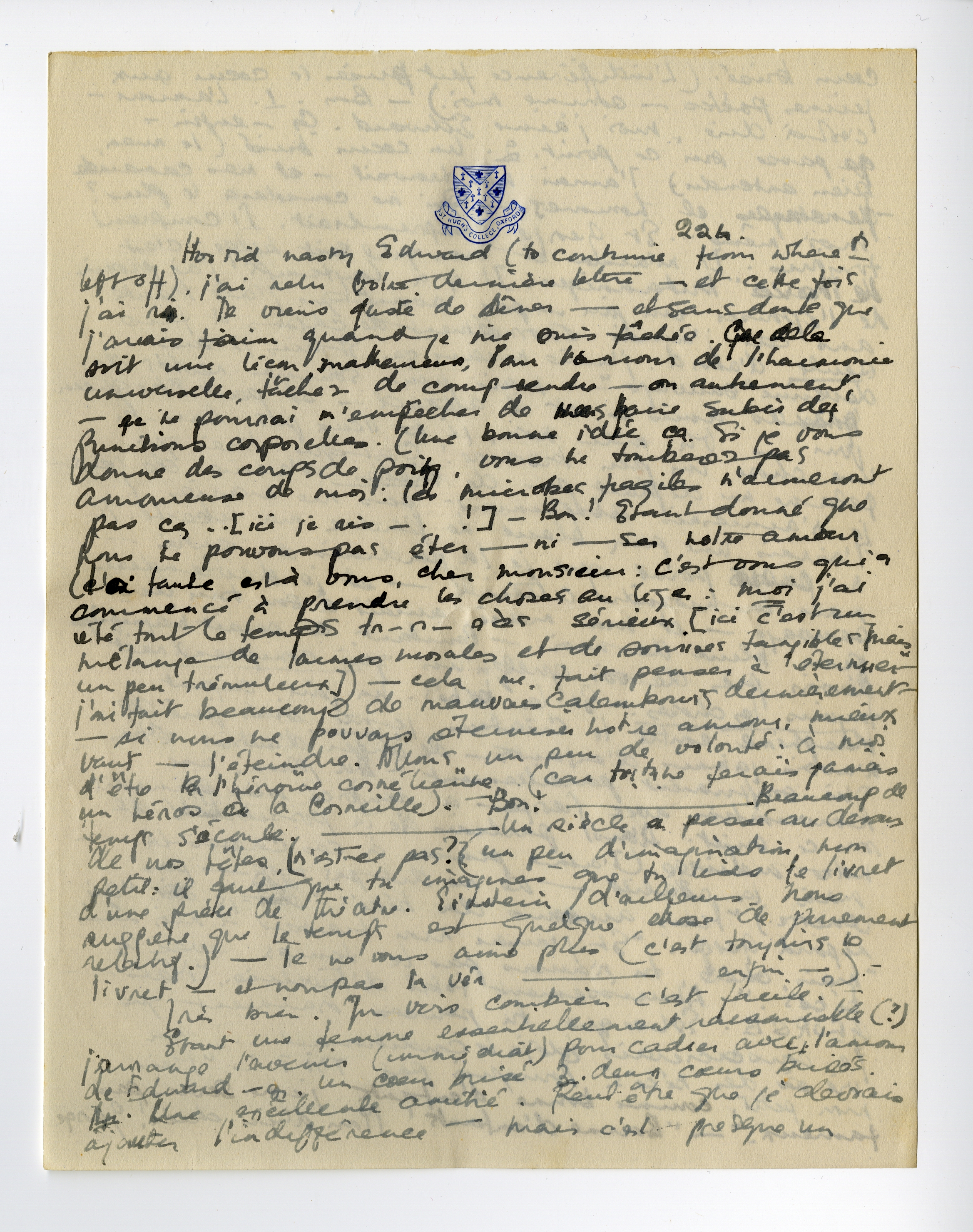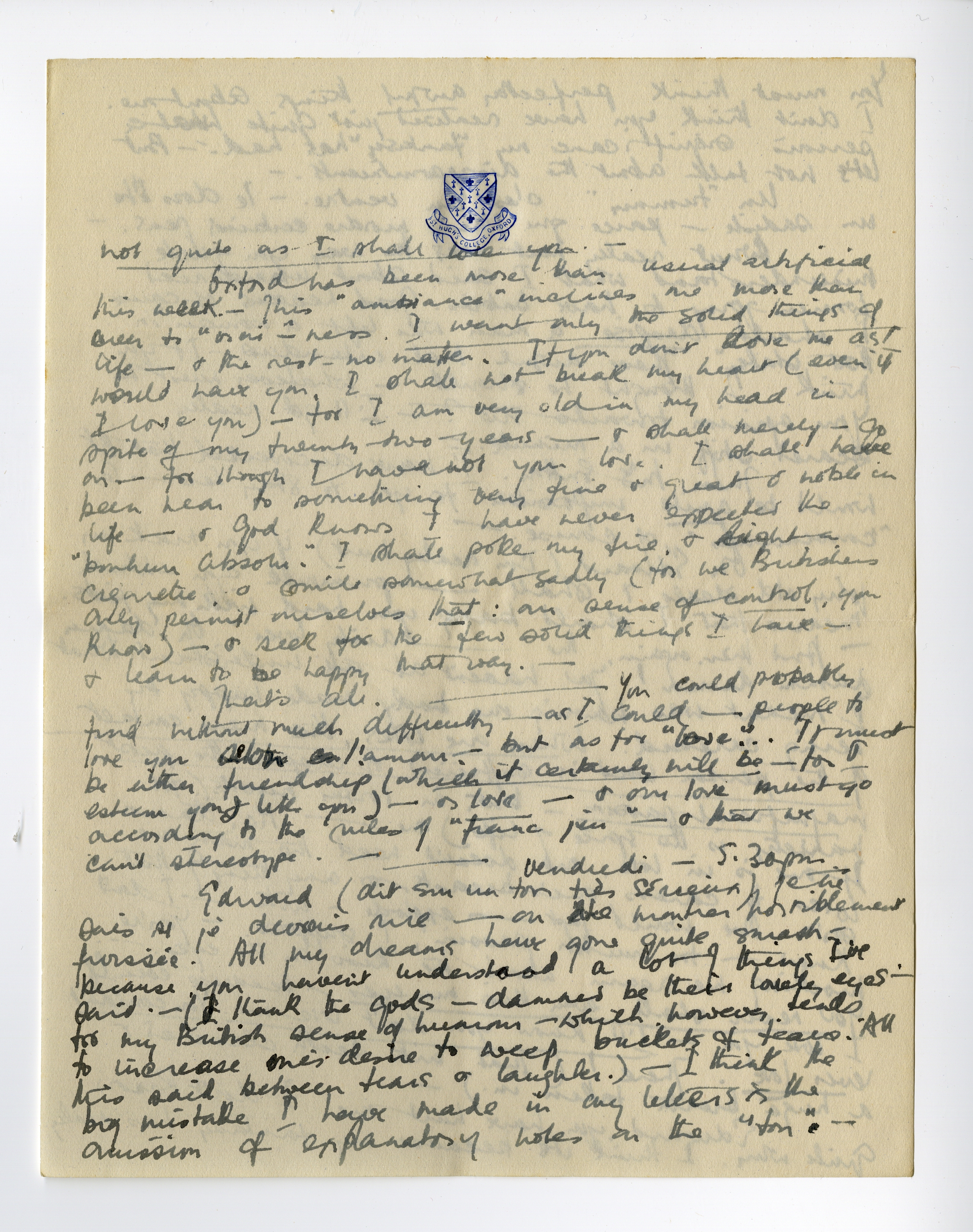Oxford has been more than usual artificial this week. - This ‘ambiance’ inclines me more than ever to ‘vrai’-ness. I want only the solid things of life - & the rest - no matter. If you don't love me as I would have you, I shall not break my heart (even if I love you) - for I am very old in my head in spite of my twenty-two years - & shall merely - go on - for though I have not your love, I shall have been near to something very fine & great & noble in life - & God knows I have never expected the ‘bonheur absolu’. I shall poke my fire, & light a cigarette, & smile somewhat sadly (for we Britishers only permit ourselves that: our sense of control, you know) - & seek for the few solid things I have - & learn to be happy that way. -
