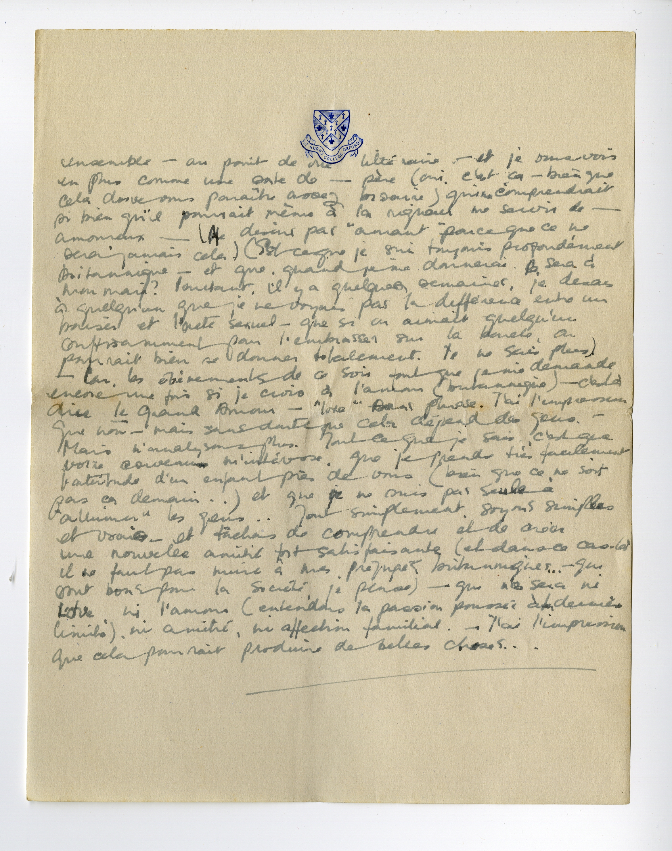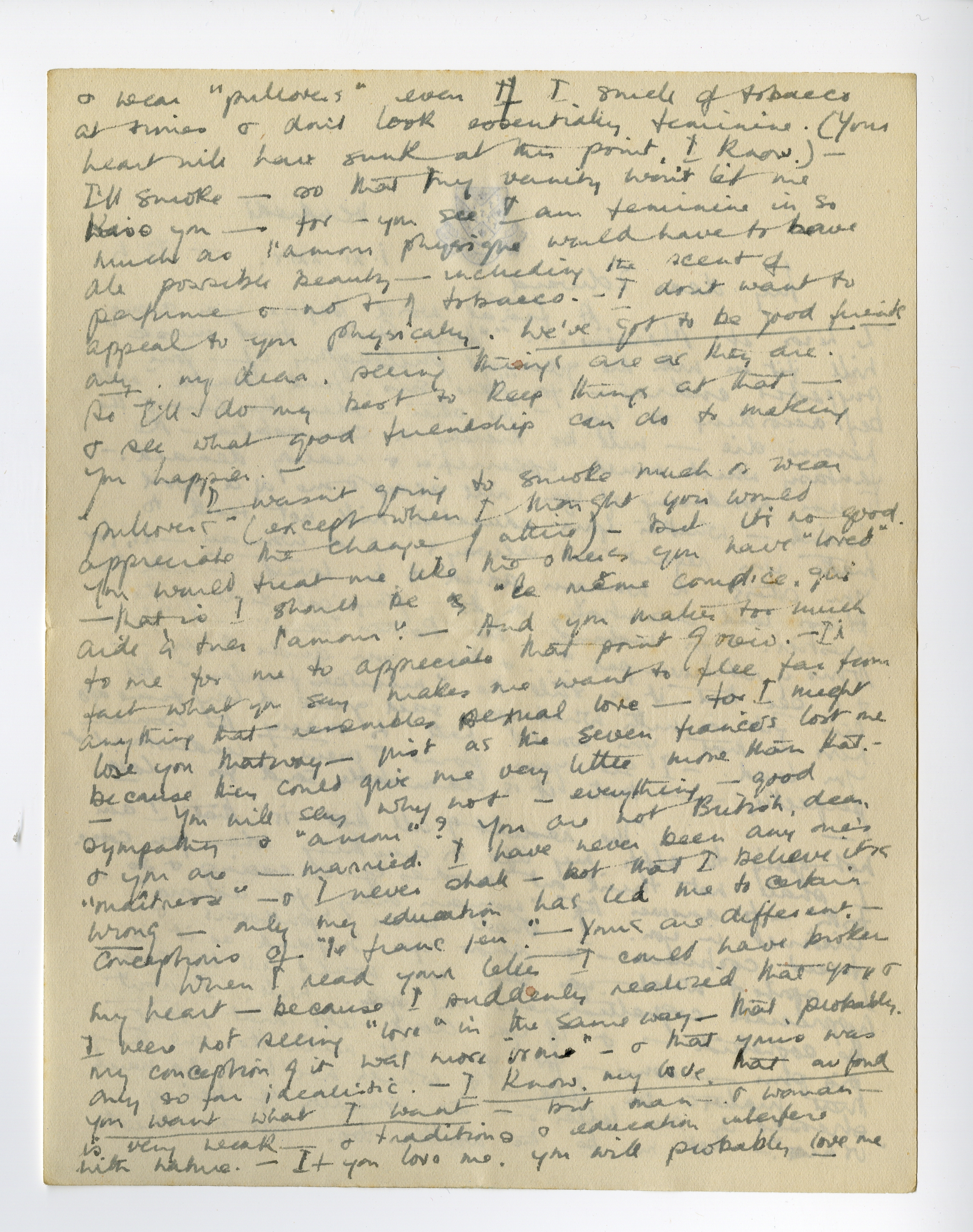 The result of all that is that I am not going to alter my life or anything when you come. I shall not think out modes of dressing & so forth - to answer the ‘woman only for “amour”’ instinct in you. I shall wear ‘pullovers’ & tweed costumes - & show you England as it is. In spite of what you say, you would all the same appreciate coquettishness in me. Well, I won't be coquettish - & if you don't like that, tant pis pour - nous, - for you will miss the one thing that matters in life - & which we have so much shard in our letters - the quality of being ‘vraie’. - Let me be the worker too. Let me shoot & wear ‘pullovers’ even if I smell of tobacco at times & don't look essentially feminine. (Your heart will have sunk at this point, I know.) - I'll smoke - so that my vanity won't let me kiss you - for - you see I am feminine in so much as l'amour physique would have to have all possible beauty - including the scent of perfume & not of tobacco. - I don't want to appeal to you physically. We've got to be good friends only, my dear, seeing things are as they are, so I'll do my best to keep things at that - & see what good friendship can do to making you happier. -
