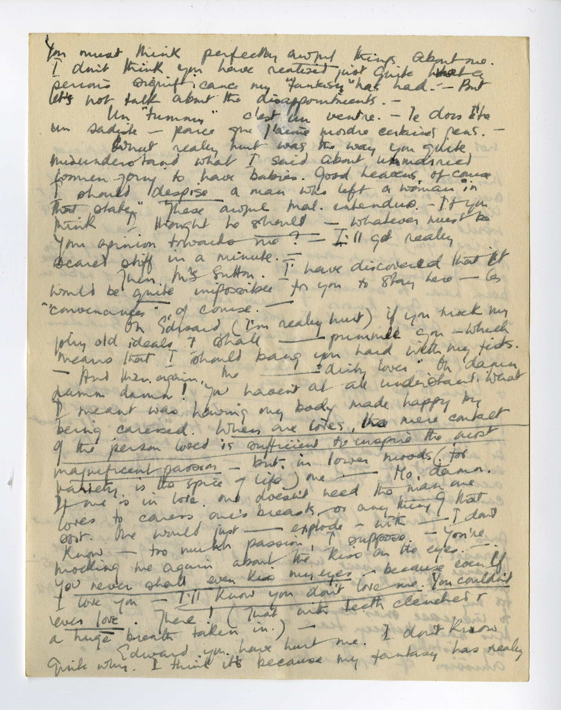 Oh Edward (I'm really hurt) if you mock my jolly old ideals I shall - pummel you - which means that I should bang you hard with my fists. - And then again, the - dirty lover’. Oh damn damn damn! You haven't at all understood. What I meant was having my body made happy by being caressed. When one loves, the mere contact of the person loved is sufficient to inspire the most magnificent passion - but, in lower moods, (for variety is the spice of life) one - No, damn. If one is in love, one doesn't need the man one loves to caress one's breasts or anything of that sort. One would just - explode - with - I don't know - too much passion, I suppose. - You're mocking me again about the kiss on the eyes. - You never shall even kiss my eyes - because even if I love you - I'll know you don't love me. You couldn't ever love. There! (That with teeth clenched & a huge breath taken in.) -