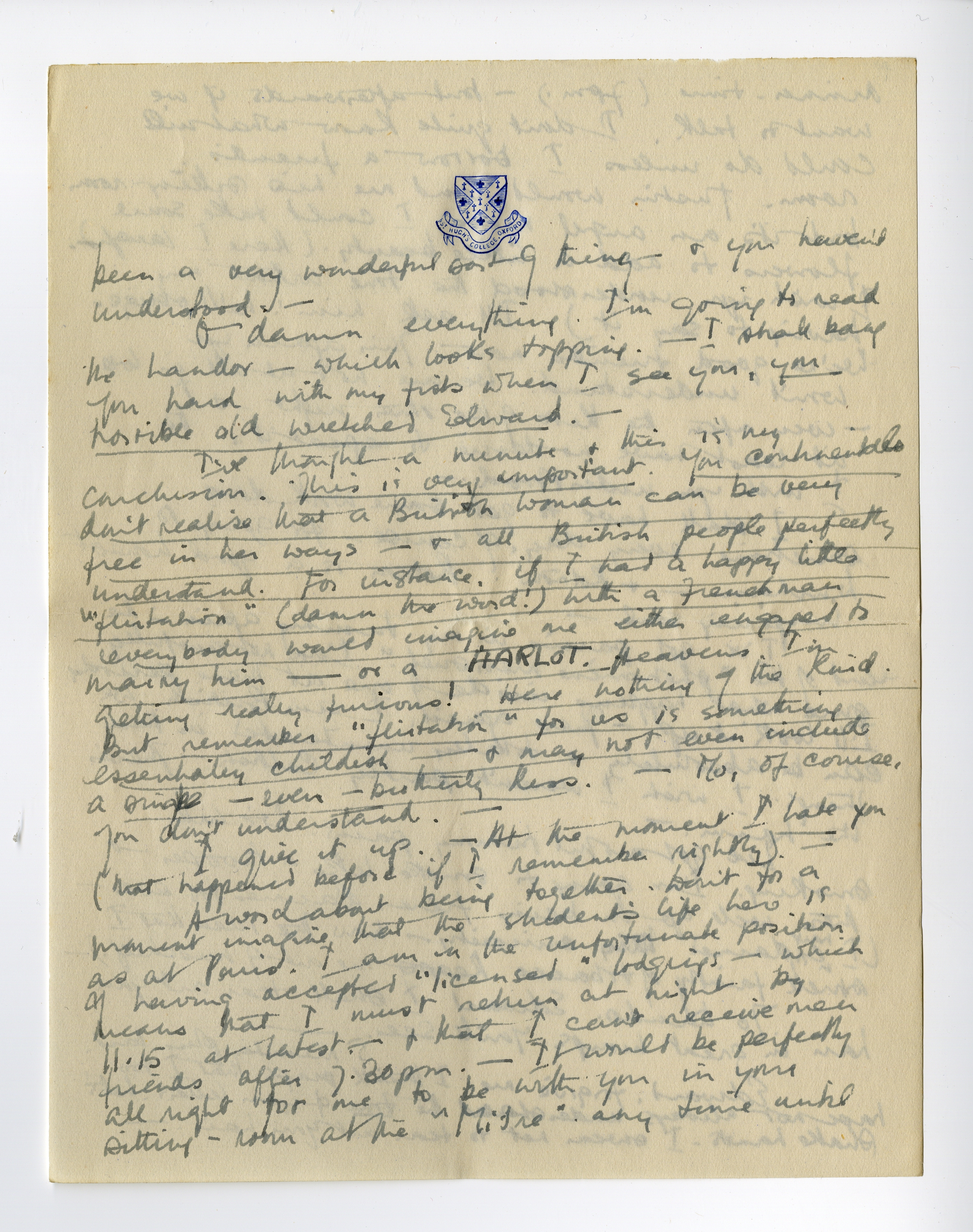 I've thought a minute & this is my conclusion. This is very important. You continentals don't realise that a British woman can be very free in her ways - & all British people perfectly understand. For instance, if I had a happy little ‘flirtation’ (damn the word!) with a Frenchman everybody would imagine one either engaged to marry him - or a HARLOT. Heavens, I'm getting really furious! Here nothing of the kind. But remember ‘flirtation’ for us is something essentially childish - & may not even include a single - even - brotherly kiss. - No, of course, you don't understand. -