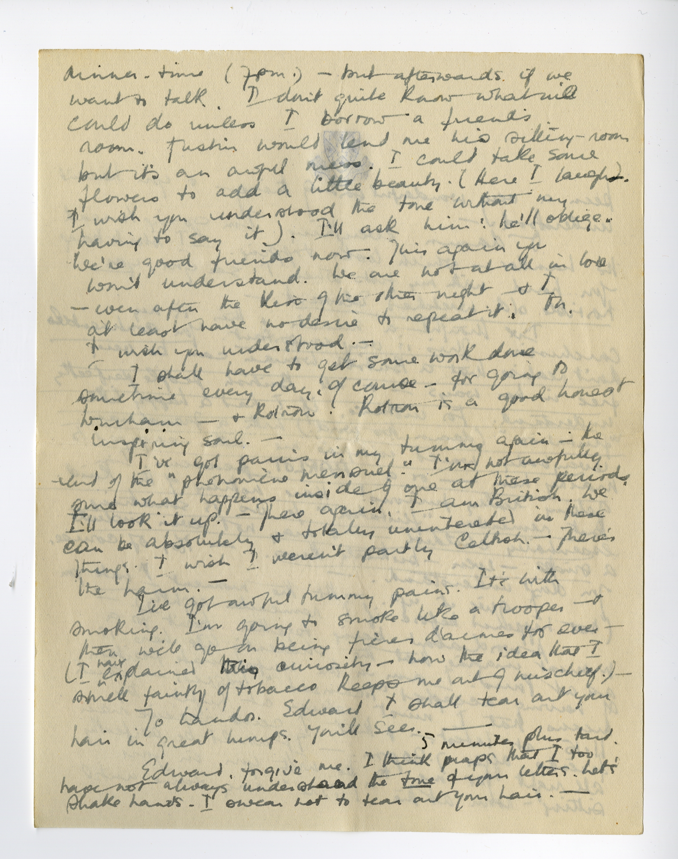 I've got awful tummy pains. It's with smoking. I'm going to smoke like a trooper - & then will go on being frères d'armes for ever - (I have explained this curiosity - how the idea that I smell faintly of tobacco keeps me out of mischief.) -