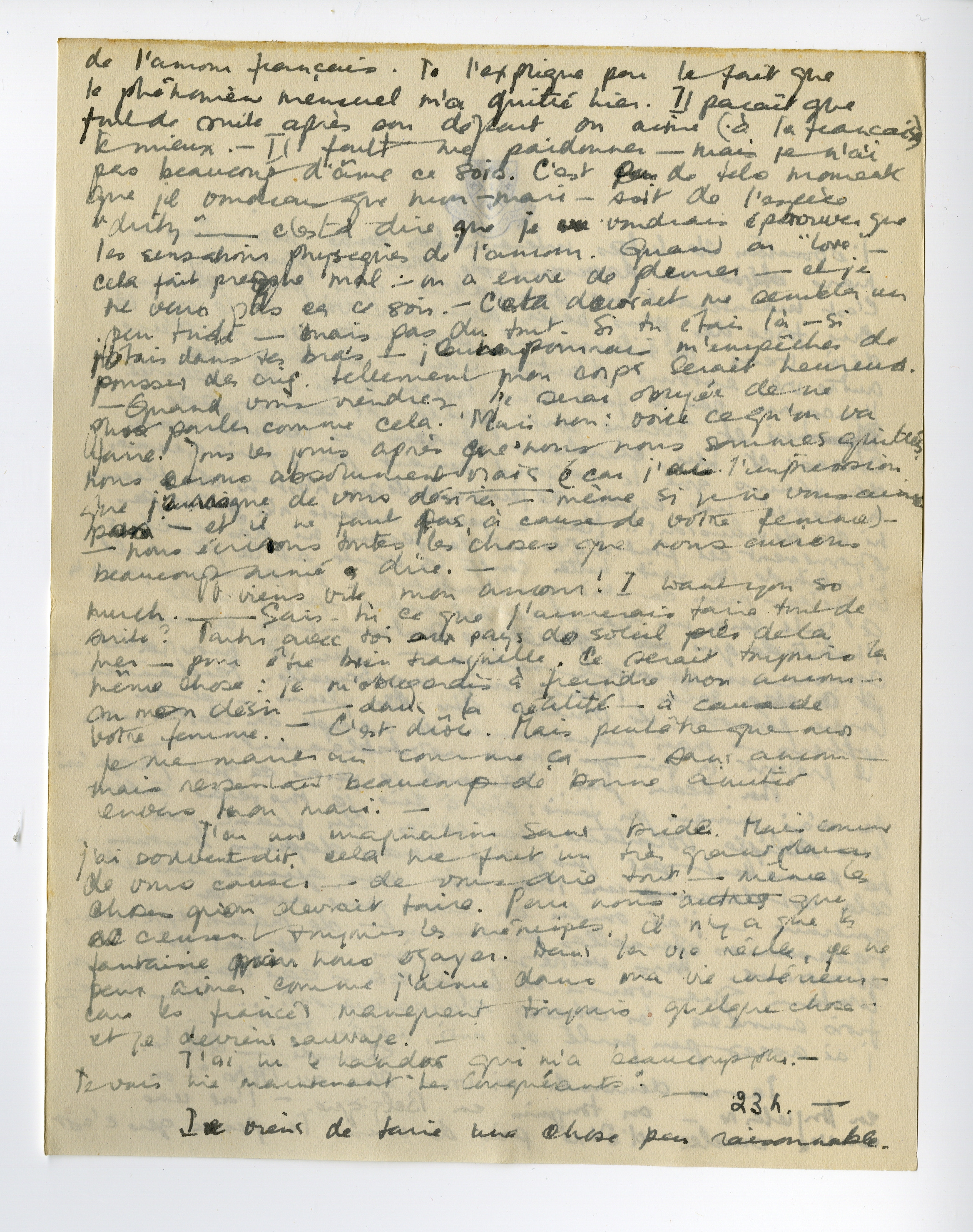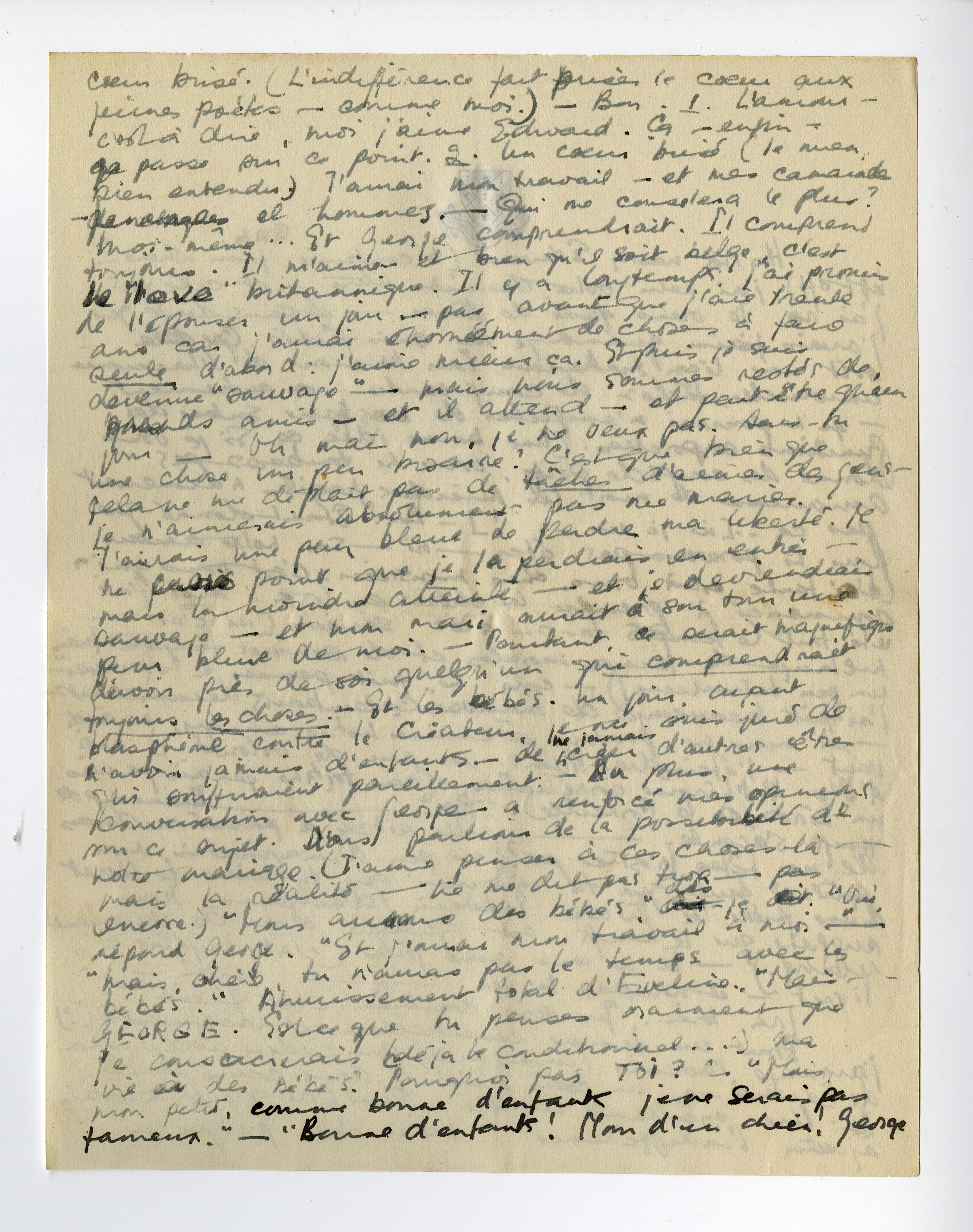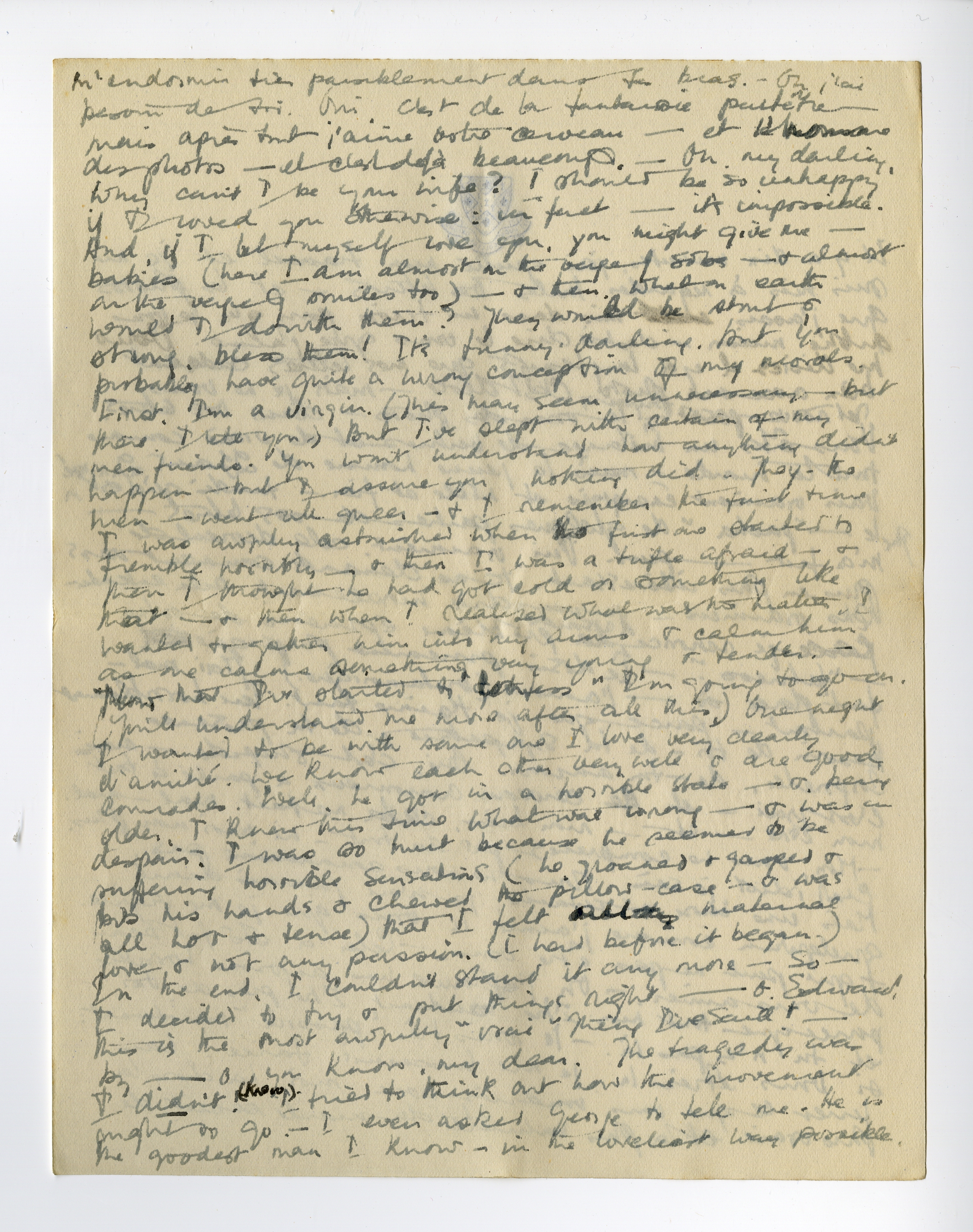 Je viens de faire une chose peu raisonnable. Il y a dix minutes, j'ai quitté mon travail et je me suis mis à regarder tous vos lettres - et les photos que j'avais mis dans un tiroir pour que je vous oublie mieux - c'est-à-dire le vous que j'aime. Vous me disiez il y a longtemps que mes lettres cadrent bien avec ma photo. C'est drôle - mais je ne vous retrouve point toujours le vous des photos - dans vos lettres. Vous êtes un mélange de vertus et de vices comme tout le monde - mais le jeune homme de 22 ans a l'air vraiment énergique et noble et fier. - tandis qu'il est arrivé que le - ‘pacha’ de quelques parties de vos lettres - m'a fait - peur. Oui, vraiment, cela devient de plus en plus intéressant. Je me demande comment vous êtes vraiment - je veux dire moralement, bien entendu - car je renonce à résoudre le problème épineux de votre - ‘fatness’. - Le désir purement physique fait place à - l'amour (britannique.) J'ai mal - partout - parce que je t'aime tant. J'ai horriblement besoin de toi - de ta sympathie et de ta présence corporelle, de - ton amour. Oui, c'est stupide - mais c'est vrai - et le cerveau amoureux a parlé tout mon être - et - mon Dieu, cela me fait mal - mal. - Non, vous ne comprenez pas du tout - ni moi non plus. C'est idiot, je sais. Nous ne nous connaissons pas. Mais une chose est certaine, je n'ai jamais aimé quelqu'un comme j'aime le vous que je me figure - qui peut ne pas être vous. - Cela a été fort beau de vous aimer. - Oh, j'éprouve une angoisse horrible parce que tout mon être voudrait être près de toi - et tu n'es pas là. - Je suis très ‘passive’ maintenant: si vous étiez là je me laisserais faire: vous feriez ce que vous voudriez avec moi. La chose la plus vraie et la plus naturelle du monde serait de m'endormir très paisiblement dans tes bras. - Oh, j'ai besoin de toi. Oui, c'est la fantaisie peut-être - mais après tout j'aime votre cerveau - et l'homme des photos - et c'est déjà beaucoup. - Oh, my darling, why can't I be your wife? I should be so unhappy if I loved you otherwise: in fact - it's impossible. And, if I let myself love you, you might give me - babies (here I am almost on the verge of sobs - & almost on the verge of smiles too) - & then, what on earth would I do with them? They would be stout and strong, bless them! It's funny, darling, but you probably have quite a wrong conception of my moods. First, I'm a virgin. (This may seem unnecessary - but there, I tell you.) But I've slept with certain of my men friends. You won't understand how anything didn't happen - but I assure you nothing did. They - the men - went all queer - & I remember the first time I was awfully astonished when the first one started to tremble horribly - & then I was a trifle afraid - & then I thought he had got cold or something like that - & then when I realised what was the matter, I wanted to gather him into my arms & calm him as one calms something very young & tender. - Now that I've started to ‘confess’ I'm going to go on. (You'll understand me more after all this.) One night I wanted to be with some one I love very dearly d'amitié. We know each other very well and are good comrades. Well, he got in a horrible state - &, being older, I knew this time what was wrong - & was in despair. I was so hurt because he seemed to be suffering horrible sensations (he groaned, gasped & bit his hand & chewed the pillow-case - & I was all hot & tense) that I felt all maternal love & not any passion (I had before it began.) In the end, I couldn't stand it any more - So - I decided to try & put things right - o, Edward, this is the most awfully ‘vrai’ thing I've said ! - by - o, you know, my dear. The tragedy was I didn't know - I tried to think out how the movement ought to go. - I even asked George to tell me. He is the goodest man I know - in the loveliest way possible. He loves me. So when I said, ‘Tell me, dear, what to do,’ he nearly died with horror (his pure young Eveline) - but in the end, I gathered how to do it. (This is - dreadful - but you'll understand me more). I got very tired - & when it was nearly finished, I remeber George moaning, ‘Oh, mais c'est sale!’ - but it wasn't - & then ‘Tu vas te salir!’ - When it was over, I remember George's horror as he saw me hold up my hand all wet with a look of slow astonishment on my face. I was awfully tired - & wanted to sleep - & went away to the opposite corner of the bed. George thought I was shocked - & was nearly in tears that my ideals had crashed down - & then he said, ‘Ne me laisse pas seul’ - & I took him in my arms & put him to sleep. - All that was very lovely & good, really--