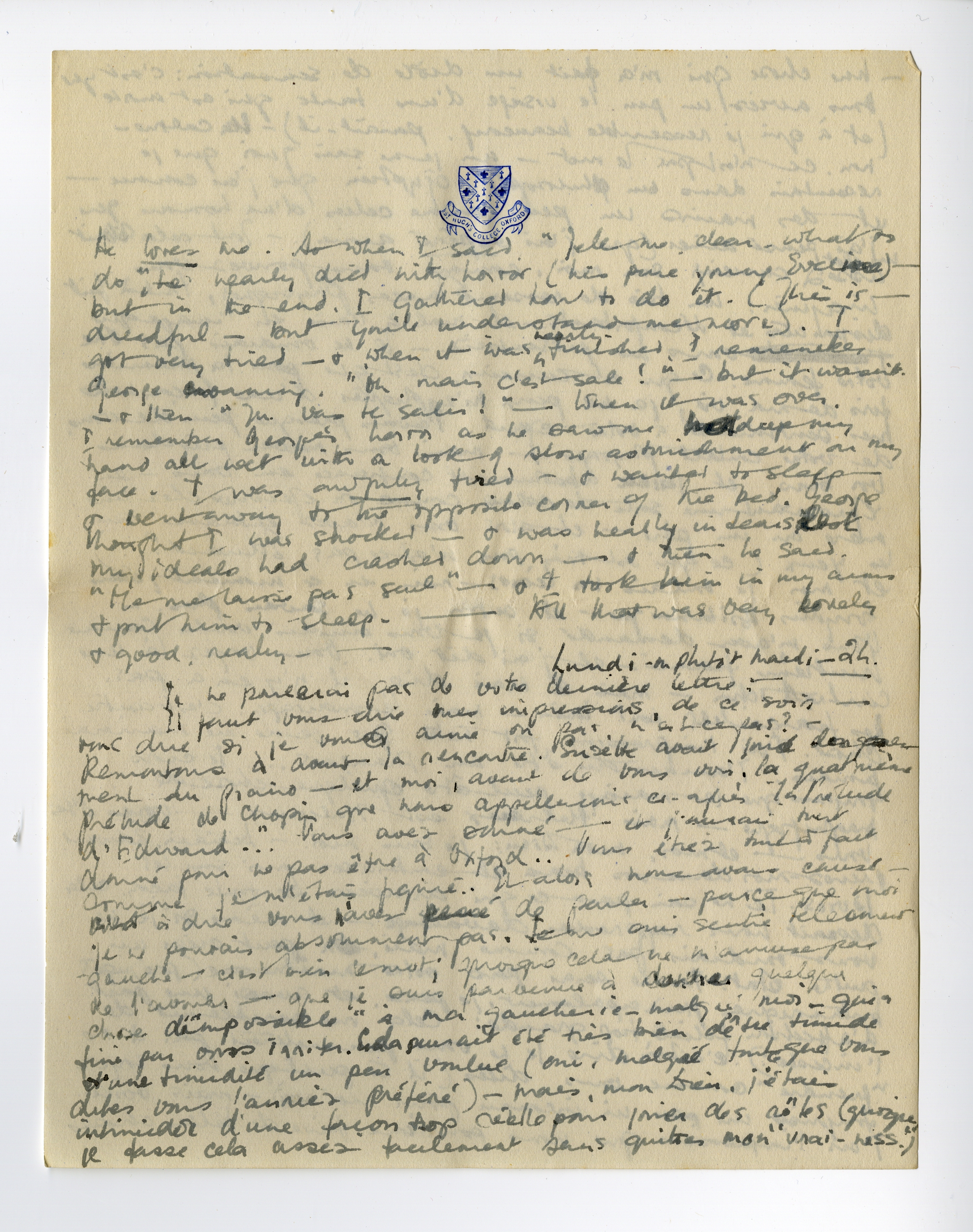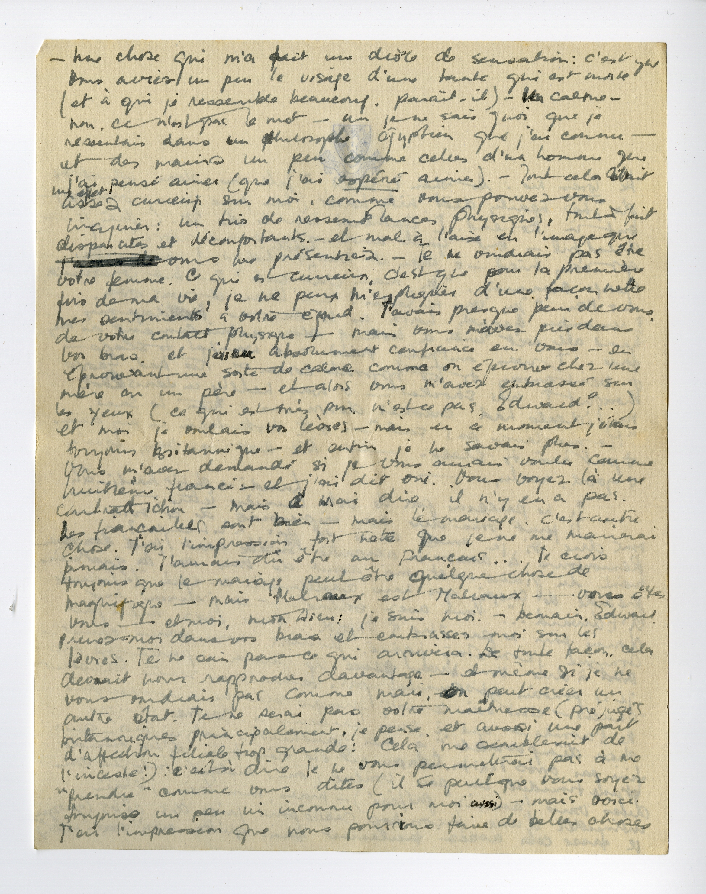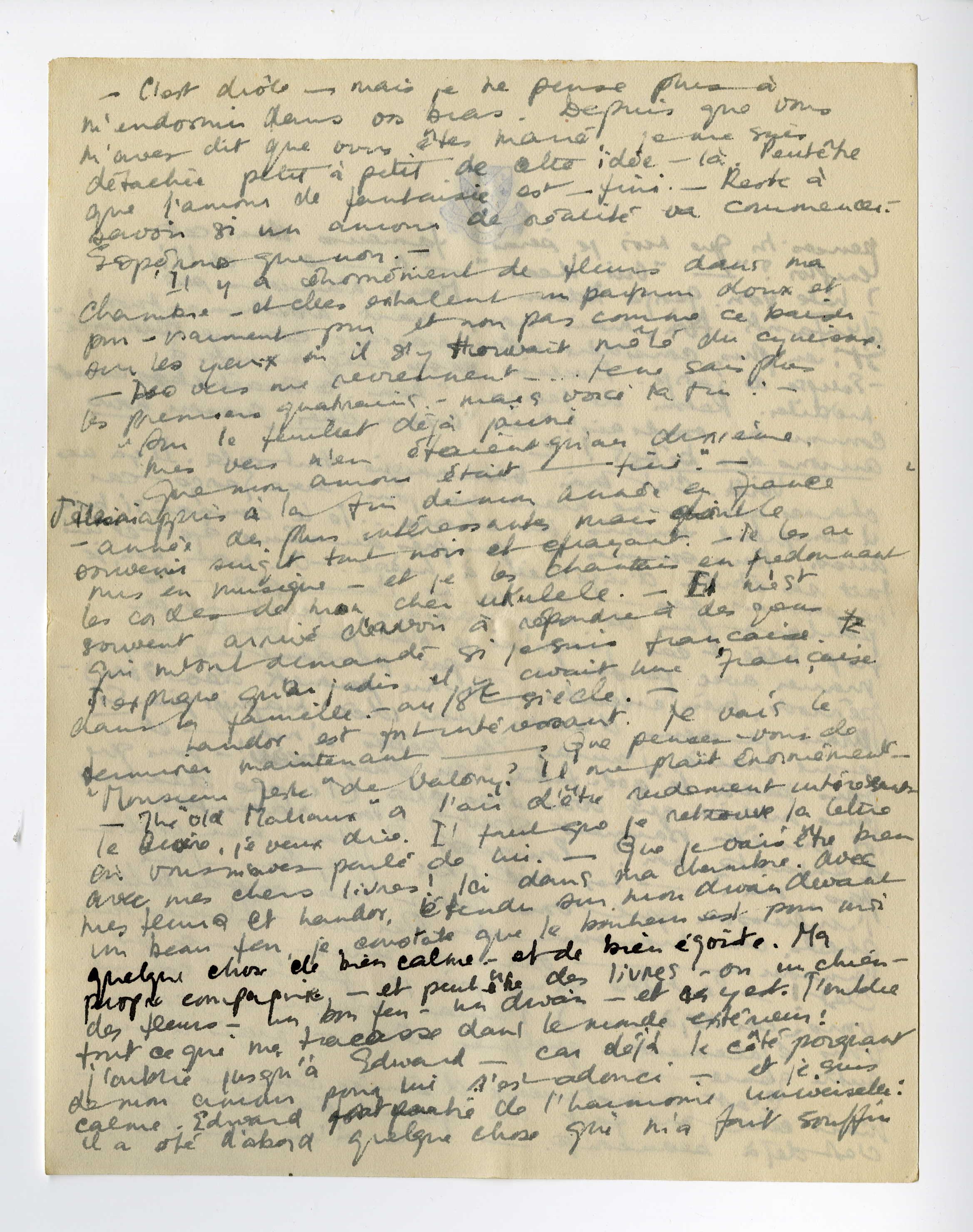 Je viens de faire une chose peu raisonnable. Il y a dix minutes, j'ai quitté mon travail et je me suis mis à regarder tous vos lettres - et les photos que j'avais mis dans un tiroir pour que je vous oublie mieux - c'est-à-dire le vous que j'aime. Vous me disiez il y a longtemps que mes lettres cadrent bien avec ma photo. C'est drôle - mais je ne vous retrouve point toujours le vous des photos - dans vos lettres. Vous êtes un mélange de vertus et de vices comme tout le monde - mais le jeune homme de 22 ans a l'air vraiment énergique et noble et fier. - tandis qu'il est arrivé que le - ‘pacha’ de quelques parties de vos lettres - m'a fait - peur. Oui, vraiment, cela devient de plus en plus intéressant. Je me demande comment vous êtes vraiment - je veux dire moralement, bien entendu - car je renonce à résoudre le problème épineux de votre - ‘fatness’. - Le désir purement physique fait place à - l'amour (britannique.) J'ai mal - partout - parce que je t'aime tant. J'ai horriblement besoin de toi - de ta sympathie et de ta présence corporelle, de - ton amour. Oui, c'est stupide - mais c'est vrai - et le cerveau amoureux a parlé tout mon être - et - mon Dieu, cela me fait mal - mal. - Non, vous ne comprenez pas du tout - ni moi non plus. C'est idiot, je sais. Nous ne nous connaissons pas. Mais une chose est certaine, je n'ai jamais aimé quelqu'un comme j'aime le vous que je me figure - qui peut ne pas être vous. - Cela a été fort beau de vous aimer. - Oh, j'éprouve une angoisse horrible parce que tout mon être voudrait être près de toi - et tu n'es pas là. - Je suis très ‘passive’ maintenant: si vous étiez là je me laisserais faire: vous feriez ce que vous voudriez avec moi. La chose la plus vraie et la plus naturelle du monde serait de m'endormir très paisiblement dans tes bras. - Oh, j'ai besoin de toi. Oui, c'est la fantaisie peut-être - mais après tout j'aime votre cerveau - et l'homme des photos - et c'est déjà beaucoup. - Oh, my darling, why can't I be your wife? I should be so unhappy if I loved you otherwise: in fact - it's impossible. And, if I let myself love you, you might give me - babies (here I am almost on the verge of sobs - & almost on the verge of smiles too) - & then, what on earth would I do with them? They would be stout and strong, bless them! It's funny, darling, but you probably have quite a wrong conception of my moods. First, I'm a virgin. (This may seem unnecessary - but there, I tell you.) But I've slept with certain of my men friends. You won't understand how anything didn't happen - but I assure you nothing did. They - the men - went all queer - & I remember the first time I was awfully astonished when the first one started to tremble horribly - & then I was a trifle afraid - & then I thought he had got cold or something like that - & then when I realised what was the matter, I wanted to gather him into my arms & calm him as one calms something very young & tender. - Now that I've started to ‘confess’ I'm going to go on. (You'll understand me more after all this.) One night I wanted to be with some one I love very dearly d'amitié. We know each other very well and are good comrades. Well, he got in a horrible state - &, being older, I knew this time what was wrong - & was in despair. I was so hurt because he seemed to be suffering horrible sensations (he groaned, gasped & bit his hand & chewed the pillow-case - & I was all hot & tense) that I felt all maternal love & not any passion (I had before it began.) In the end, I couldn't stand it any more - So - I decided to try & put things right - o, Edward, this is the most awfully ‘vrai’ thing I've said ! - by - o, you know, my dear. The tragedy was I didn't know - I tried to think out how the movement ought to go. - I even asked George to tell me. He is the goodest man I know - in the loveliest way possible. He loves me. So when I said, ‘Tell me, dear, what to do,’ he nearly died with horror (his pure young Eveline) - but in the end, I gathered how to do it. (This is - dreadful - but you'll understand me more). I got very tired - & when it was nearly finished, I remeber George moaning, ‘Oh, mais c'est sale!’ - but it wasn't - & then ‘Tu vas te salir!’ - When it was over, I remember George's horror as he saw me hold up my hand all wet with a look of slow astonishment on my face. I was awfully tired - & wanted to sleep - & went away to the opposite corner of the bed. George thought I was shocked - & was nearly in tears that my ideals had crashed down - & then he said, ‘Ne me laisse pas seul’ - & I took him in my arms & put him to sleep. - All that was very lovely & good, really--