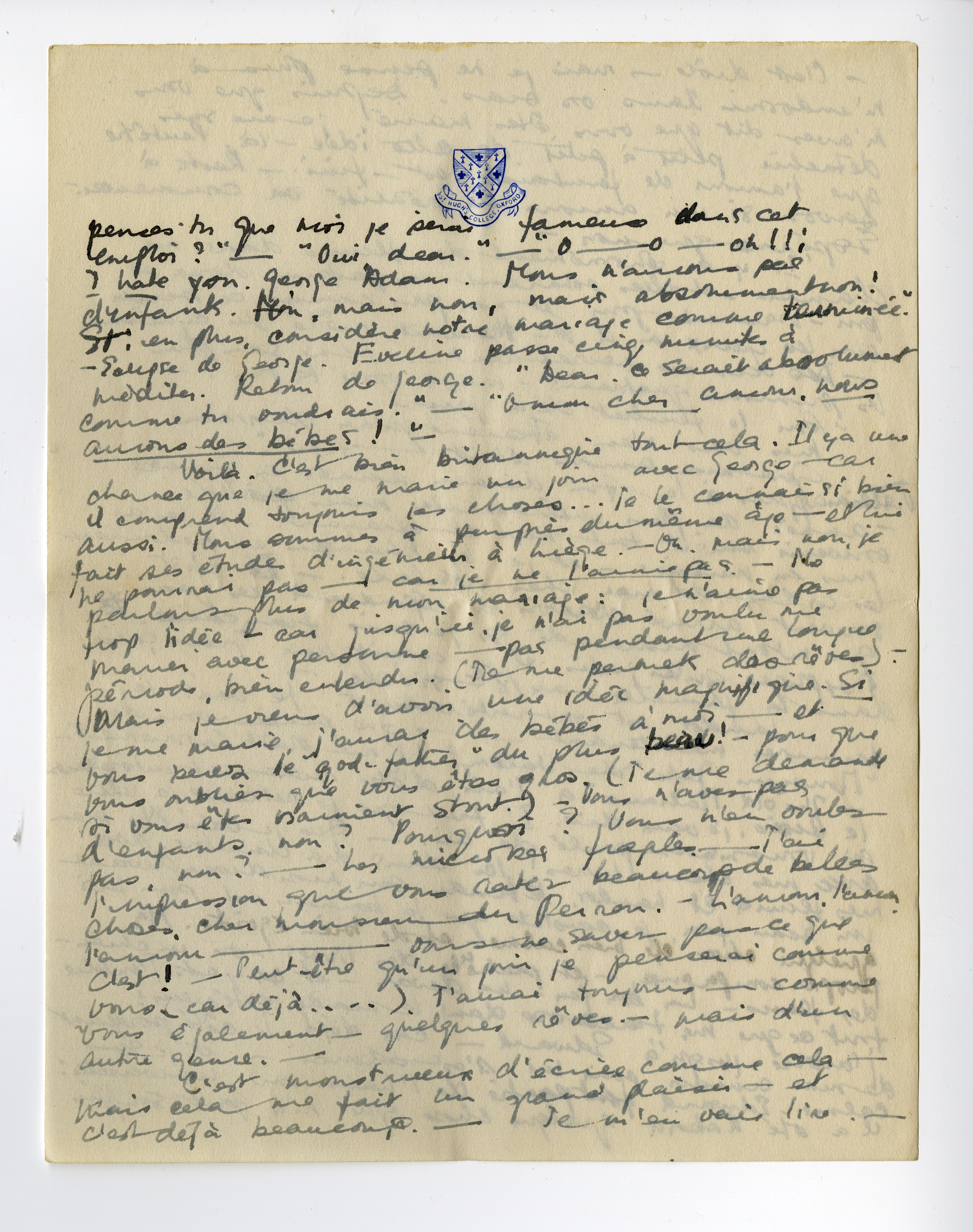 Voilà. C'est bien britannique tout cela. Il y a une chance que je me marie un jour avec George - car il comprend toujours les choses... Je le connais si bien aussi. Nous sommes à peu près du même âge - et lui fait ses études d'ingnieur à Liège. - Oh, mais non, je ne pourrais pas - car je ne l'aime pas. - Ne parlons plus de mon mariage: je n'aime pas trop l'idée - car jusqu'ici je n'ai pas voulu me marier avec personne - pas pendant une longue période, bien entendu. (Je me permets des rêves). - Mais je viens d'avoir une idée magnifique. Si je me marie, j'aurai des bébés à moi - et vous serez le ‘god-father’ du plus beau! - pour que vous oubliez que vous tes gros. (Je me demande si vous êtes vraiment stout.) Vous n'avez pas d'enfants, non? Pourquoi? Vous n'en voulez pas, non? - Les microbes fragiles - J'ai l'impression que vous ratez beaucoups de belles choses, cher monsieur du Perron. - L'amour, l'amour, l'amour - - vous ne savez pas ce que c'est! - Peut-être qu'un jour je penserai comme vous (car déjá...). J'aurai toujours - comme vous également - quelques rêves - mais d'un autre genre. -
