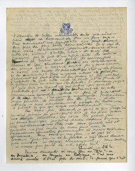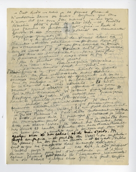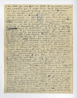 Je me demande si vous êtes au ‘Mitre’ - ou en Angleterre - ou toujours en Belgique. - J'ai une envie cruelle d'être pès de vous. Je pense que c'est de l'amour français. Je l'explique par le fait que le phénomène mensuel m'a quitté hier. Il paraît que tout de suite après son départ on aime (à la française) le mieux. - Il faut me pardonner - mais je n'ai pas beaucoup d'âme ce soir. C'est que de tels moments que je voudrai que mon - mari - soit de l'espèce ‘duty’ - c'est-à-dire que je ne voudrais éprouver que les sensations physiques de l'amour. Quand on ‘love’ - cela fait presque mal: - on a envie de pleurer - et je ne veux pas ça ce soir. - Cela devrait me sembler un peu triste - mais pas du tout. Si tu étais là - si j'étais dans tes bras - je ne pourrais m'empêcher de pousser des cris, tellement mon corps serait heureux. - Quand vous viendrez, je serai oblige de ne pas parler comme cela. Mais non: voici ce qu'on va faire. Tous les jours après que nous nous sommes quittés, nous serons absolument vrais (car j'ai l'impression que je ris de vous désirer - même si je ne vous aime pas - et il ne faut pas, à cause de votre femme) - nous écrivons toutes les choses que nous aurions beaucoup aimé à dire. -