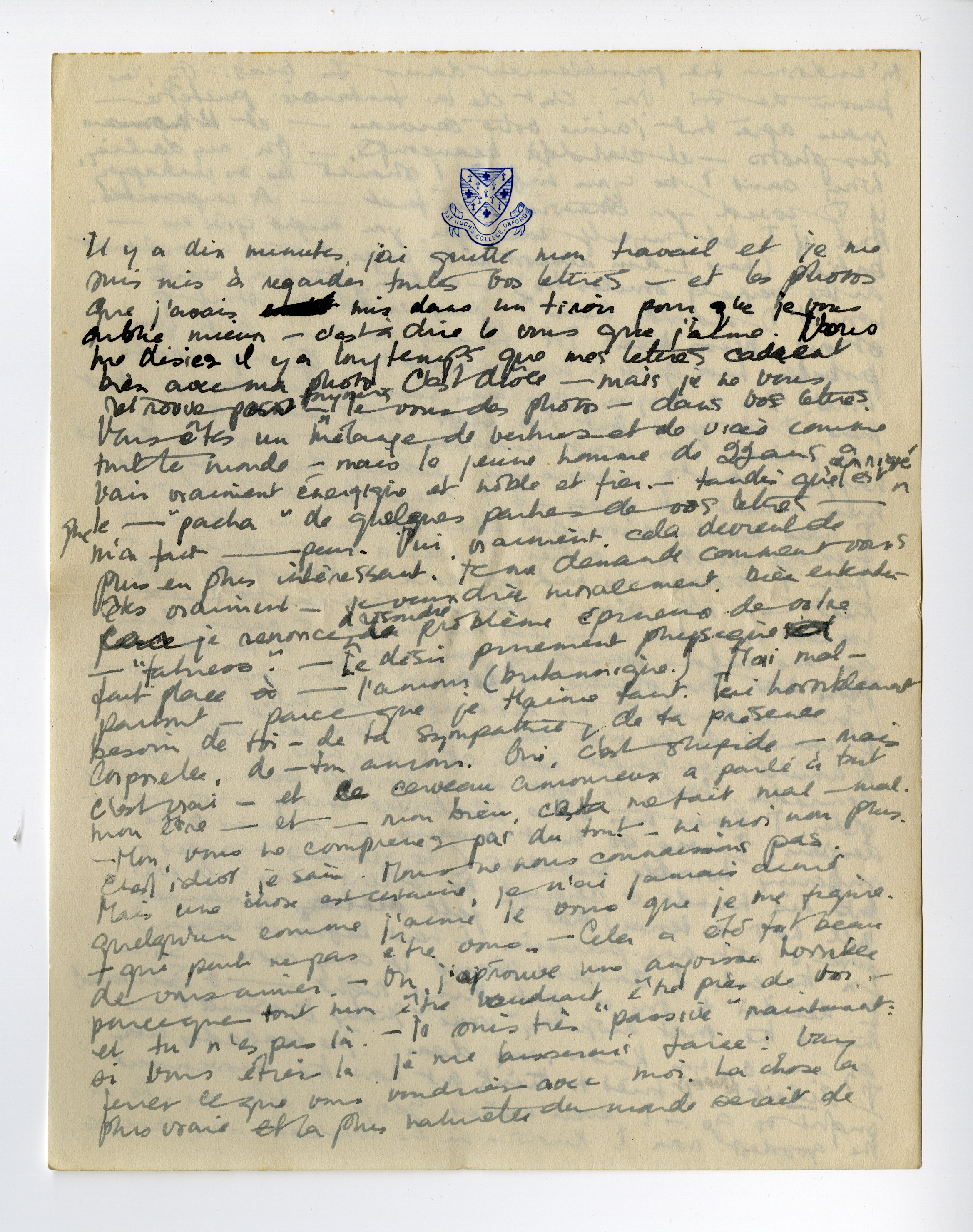 I wasn't going to smoke much or wear ‘pullovers’ (except when I thought you would appreciate the change of attire) - but it's no good, you would treat me like the others you have ‘loved’ - that is I should be ‘la même complice, qui aide à tuer l'amour’. - And you matter too much to me for me to appreciate that point of view. - In fact what you say makes me want to flee far from anything that resembles sexual love - for I might lose you that way - just as the seven fiancés lost me because they could give me very little more than that. -