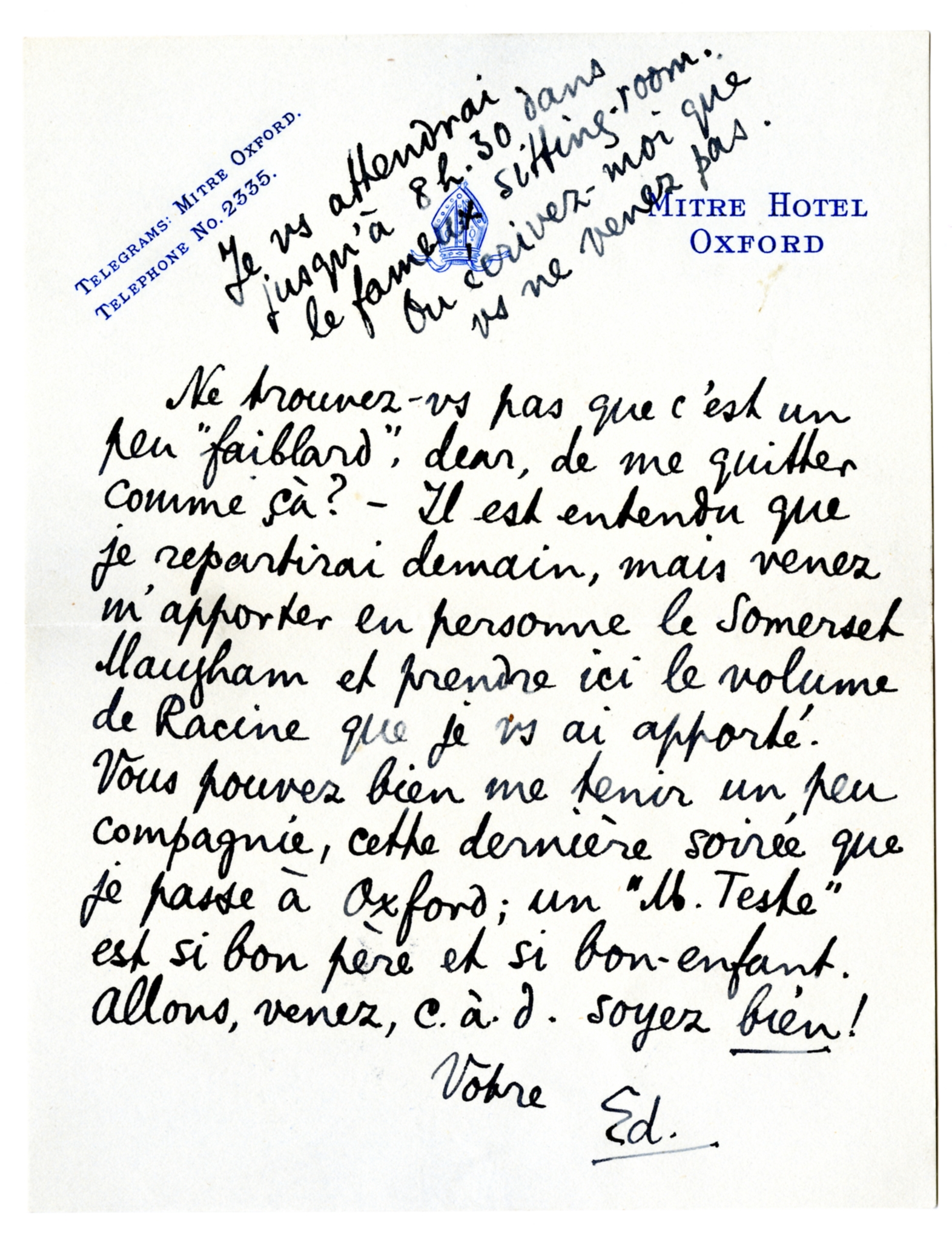 Ne vous trouvez-vs pas que c'est un peu ‘faiblard’, dear, de me quitter comme çà? - Il est entendu que je repartirai demain, mais venez m'apporter en personne le Somerset Maugham et prendre ici le volume de Racine que je vs ai apporté. Vous pouvez bien me tenir un peu compagnie, cette dernière soirée que je passe à Oxford; un ‘M. Teste’ est si bon père et si bon-enfant. Allons, venez, c.à.d. soyez bien!