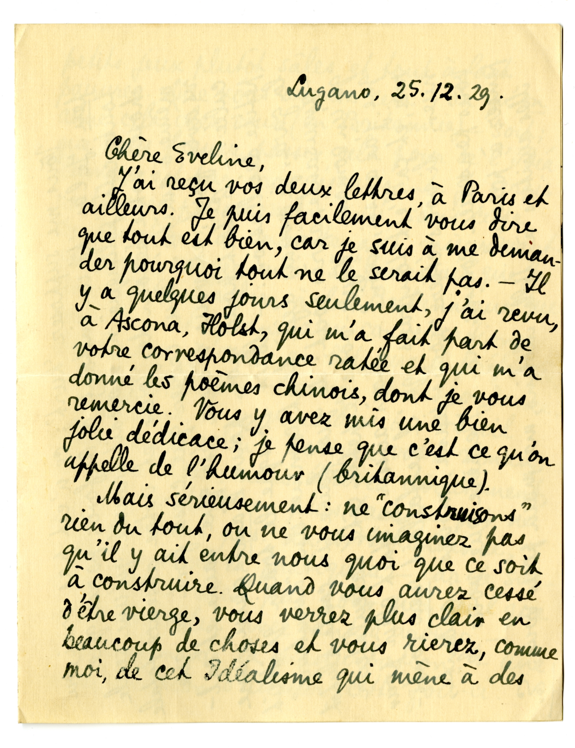 J'ai reçu vos deux lettres, à Paris et ailleurs. Je puis facilement vos dire que tout est bien, car je suis à me demander pourquoi tout ne le serait pas. - Il y a quelques jours seulement, j'ai revu, à Ascona, Holst, qui m'a fait part de votre correspondance ratée et qui m'a donné les poèmes chinois, dont je vous remercie. ous y avez mis une bien jolie dédicace; je pense que c'est ce qu'on appelle de l'humour (britannique).