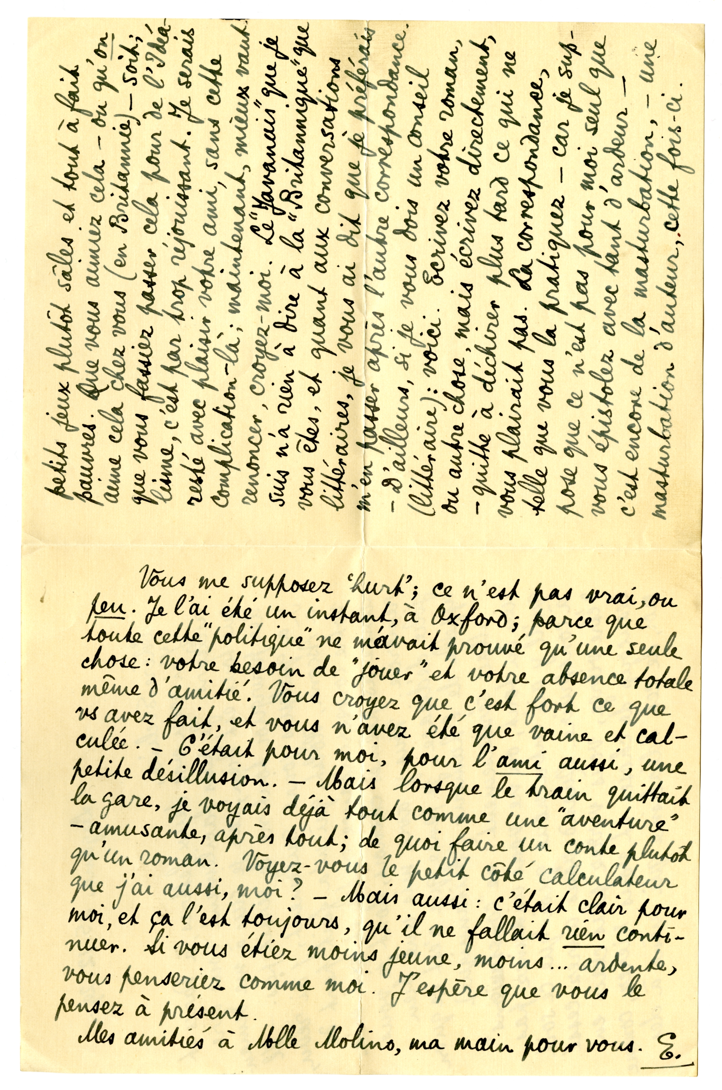 - D'ailleurs, si je vous dois un conseil (littéraire): voici. Ecrivez votre roman, ou autre chose, mais écrivez directement, - quitte à déchirer plus tard ce qui ne plus plairait pas. La correpondance, telle que vous la pratiquez - car je suppose que n'est pas pour moi seul que vous épistolez avec tant d'ardeur - c'est encore de la masturbation, - une masturbation d'auteur, cette fois-ci.