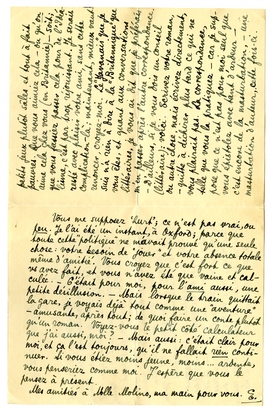 Vous me supposez ‘hurt’; ce n'est pas vrai, ou peu. Je l'ai été un instant, à Oxford; parce que toute cette ‘politique’ ne m'avait prouvé qu'une seule chose: vote besoin de ‘jouer’ et votre absence totale même d'amitié. Vous croyez que c'est fort ce que vs avez fait, et vous n'avez éte que vaine et calculée. - C'était pour moi, pour l'ami aussi, une petite désillusion. - Mais lorsque le train quittait la gare, je voyais déjà tout comme une ‘aventure’ - amusante, après tout; de quoi faire un conte plutôt de faire un roman. Voyez-vous le petit côté calculateur que j'ai aussi moi? - Mais aussi: c'était clair pour moi, et ça l'est de toujours, qu'il ne fallait rien continuer. Si vous étiez moins jeune, moins ... ardente, vous penseriez comme moi. J'espère que vous le pensez à présent.