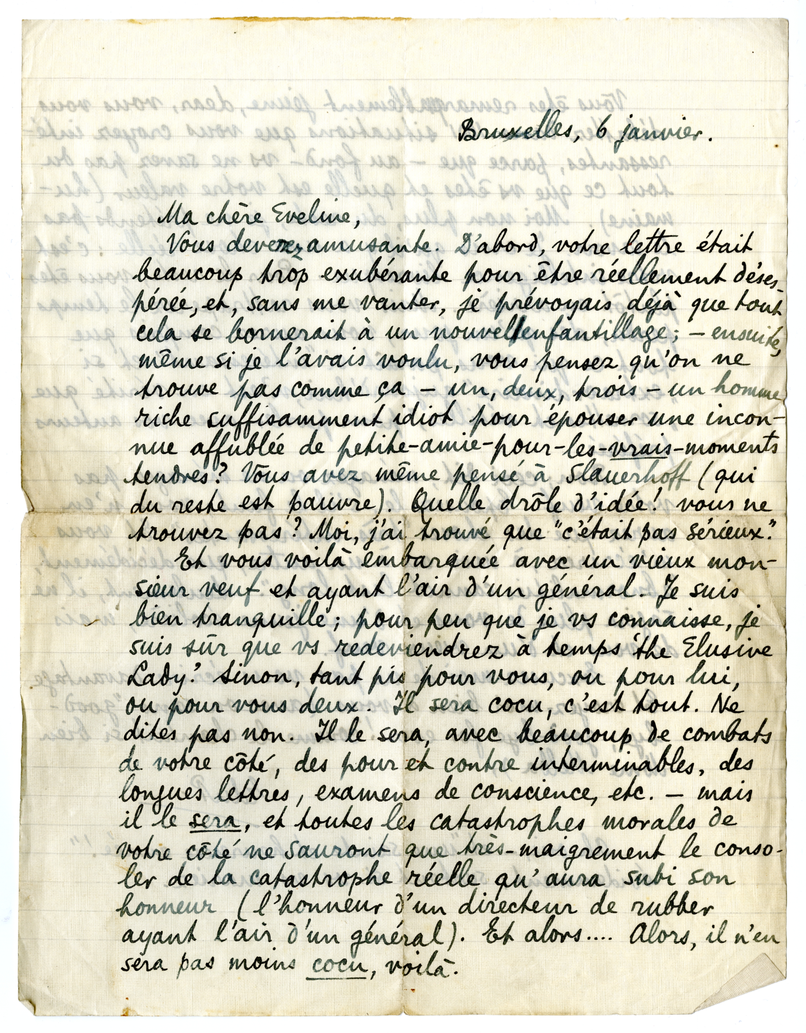 Et vous voilà embarquée avec un vieux monsieur veuf et ayant l'air d'un général. Je suis bien tranquille; pour peu que je vs connaisse, je suis sûr que vs redeviendrez à temps ‘the Elusive Lady’. Sinon, tant pis pour vous, ou pour lui, ou pour vous deux. Il sera cocu, c'est tout. Ne dites pas non. Il le sera, avec beaucoup de combats de votre côté, des pour et contre interminables, des longues lettres, examens de conscience, etc. - mais il le sera, et toutes les catastrophes morales de votre côté ne sauront que très-maigrement le consoler de la catastrophe réelle qu'aura subi son honneur (l'honneur d'un directeur de rubber ayant l'air d'un général). Et alors .... Alors, il n'en sera pas moins cocu, voilà.