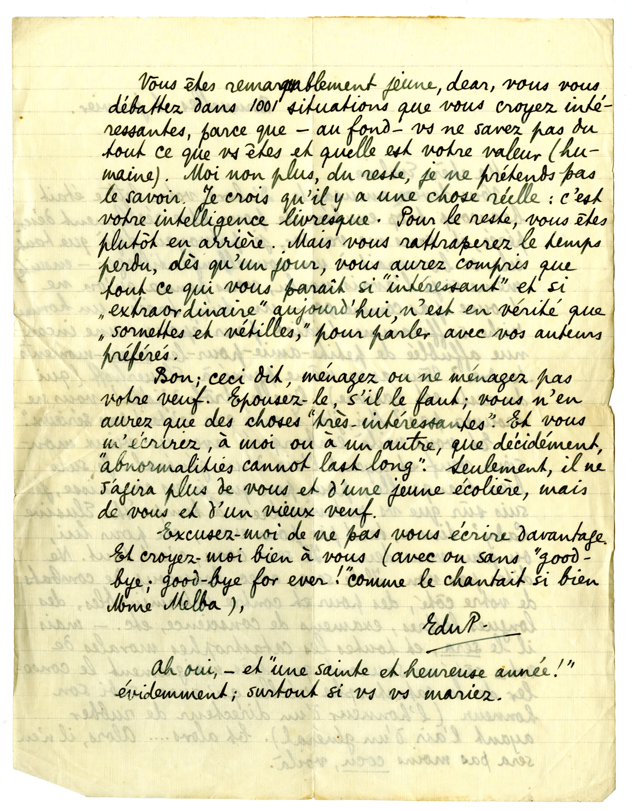 Vous êtes remarquablement jeune, dear, vous vous débattez dans 1001 situations que vous croyez intéressantes, parce que au fond - vs ne savez pas du tout ce que vs êtes et quelle est votre valeur (humaine). Moi non plus, du reste, je ne prétends pas le savoir. Je crois qu'il y a une chose réelle: c'est votre intelligence livresque. Pour le reste, vous êtes plutôt en arrière. Mais vous rattraperez le temps perdu, dès qu'un jour, vous aurez compris que tout ce qui vous paraît si ‘intéressant’ et si ‘extraordinaire’ aujourd'hui, n'est en vérité que ‘sornettes et vétilles’, pour parler avec vos auteurs préférés.