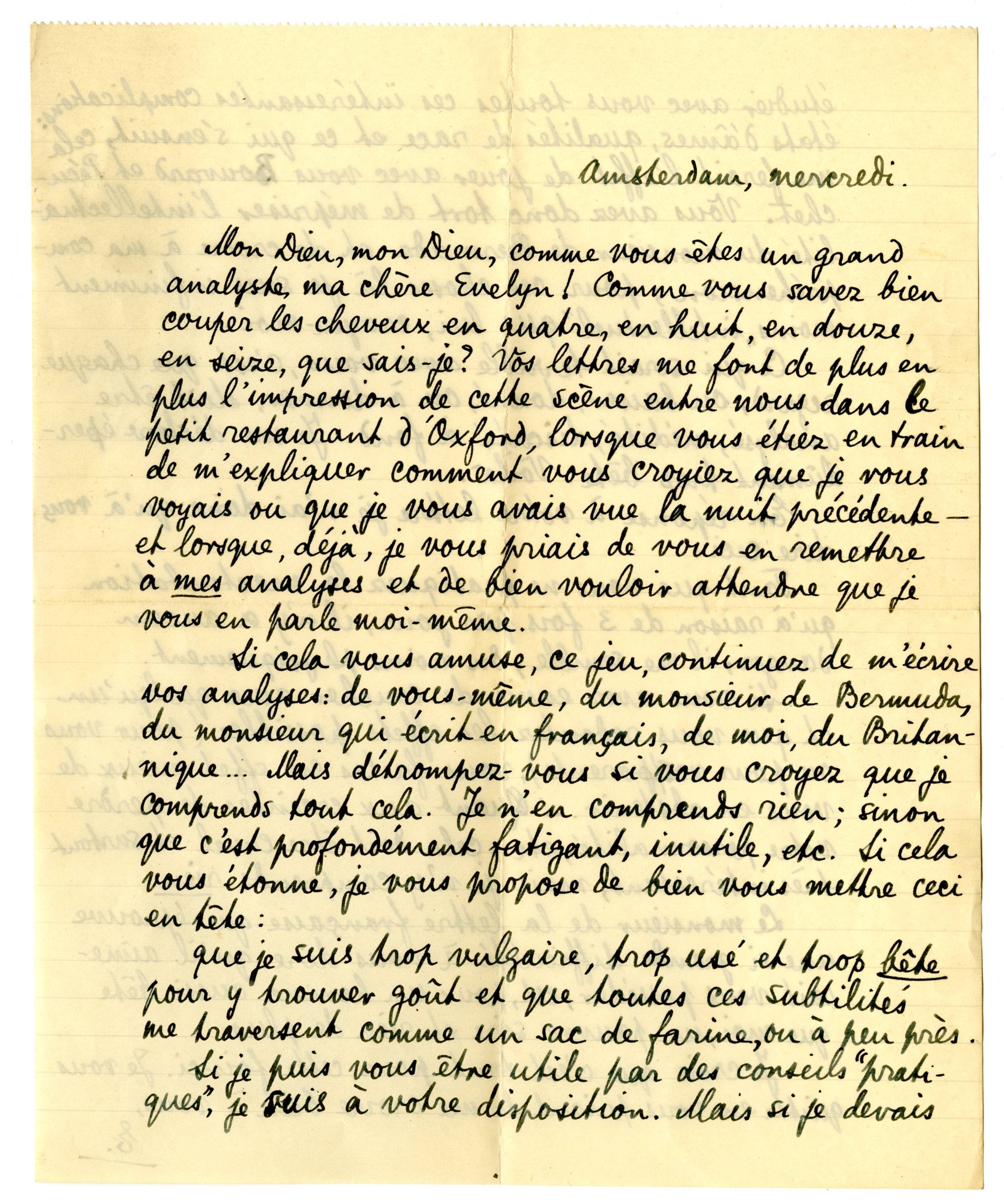 Mon Dieu, mon Dieu, comme vous êtes un grand analyste, ma chère Evelyn! Comme vous savez bien couper les cheveux en quatre, en huit, en douze, en seize, que sais-je? Vos lettres me font de plus en plus l'impression de cette scène entre nous dans le petit restaurant d'Oxford, lorsque vous étiez en train de m'expliquer comment vous croyiez que je vous voyais ou que je vous avais vue la nuit précédente - et lorsque, déjà, je vous priais de vous en remettre à mes analyses et de bien vouloir attendre que je vous en parle moi-même.