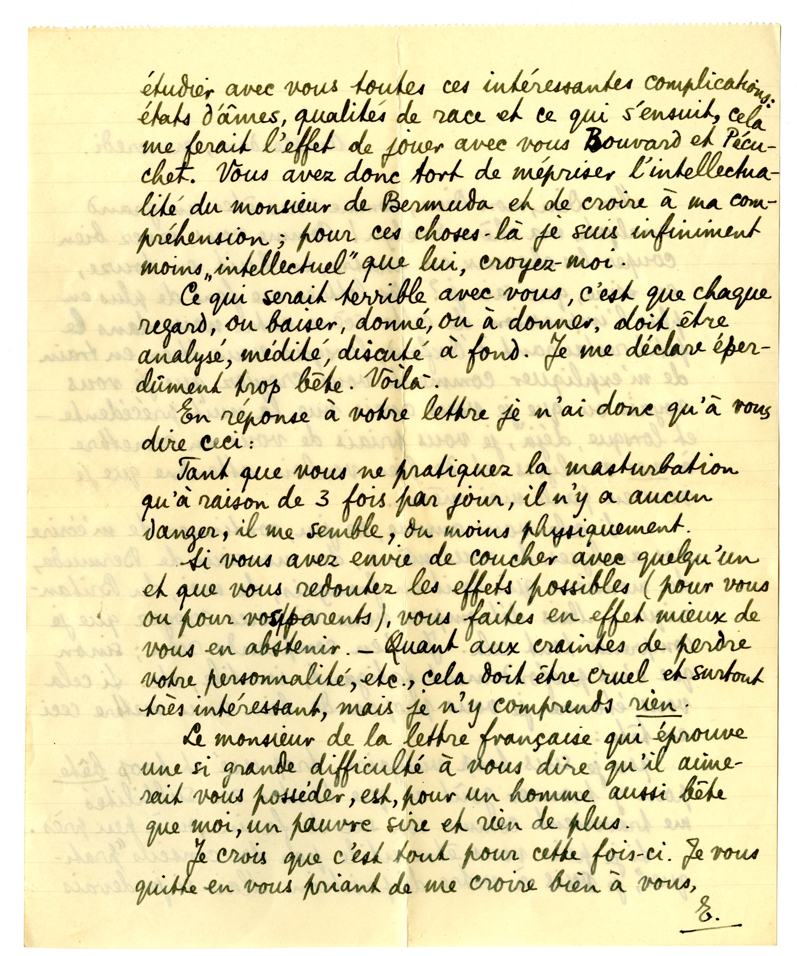 Si je puis vous être utile par des conseils ‘pratiques’, je suis votre disposition. Mais si je devais étudier avec vous toutes ces intéressantes complications: états d'âmes, qualités de race et ce qui s'ensuit, cela me ferait l'effet de jouer avec vous Bouvard et Pécuchet. Vous avez donc tort de mépriser l'intellectualité du monsieur de Bermuda et de croire à ma compréhension; pour ces choses-là je suis infiniment moins ‘intellectuel’ que lui, croyez-moi.