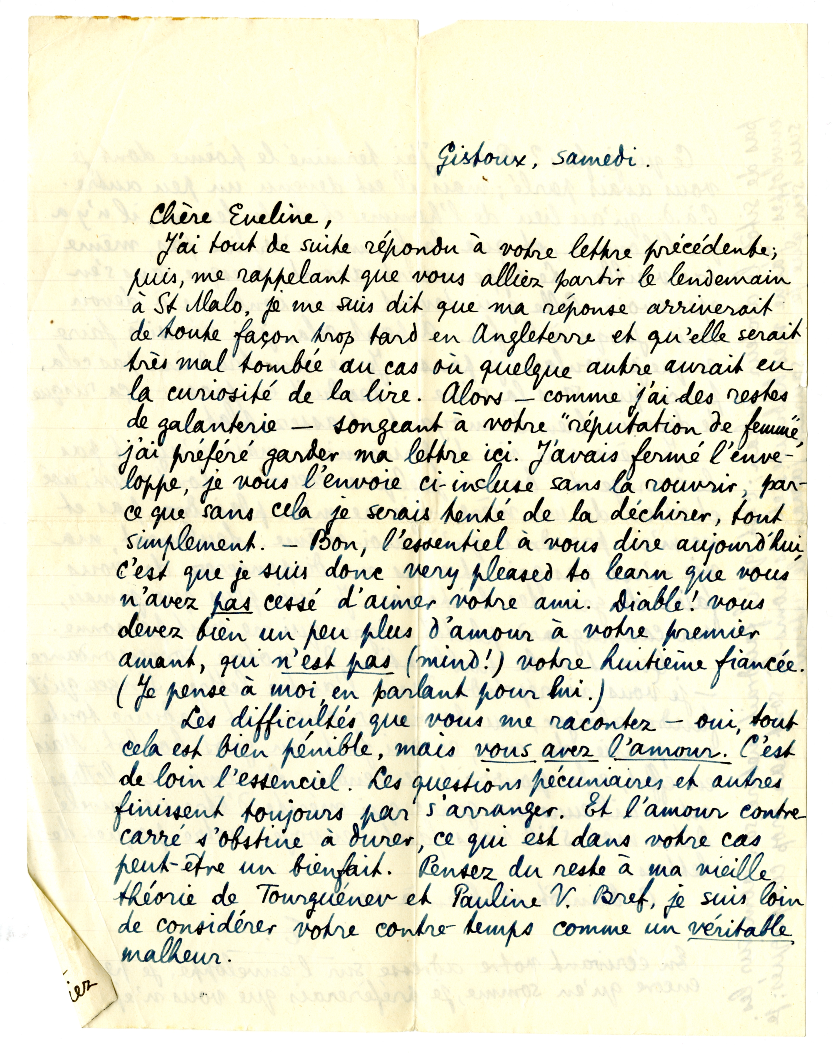 J'ai tout de suite répondu à votre lettre précédente; puis, me rappelant que vous alliez partir le lendemain à St Malo, je me suis dit que ma réponse arriverait de toute façon trop tard en Angleterre et qu'elle serait très mal tombée au cas où quelque autre aurait eu la curiosité de la lire. Alors - comme j'ai des restes de galanterie - songeant à votre ‘réputation de femme’ j'ai préféré garder ma lettre ici. J'avais fermé l'enveloppe, je vous l'envoie ci-incluse sans la rouvrir, parce que sans cela je serais tenté de la déchirer, tout simplement. - Bon, l'essentiel à vous dire aujourd'hui, c'est que je suis donc very pleased to learn que vous n'avez pas cessé d'aimer votre ami. Diable! vous devez bien un peu plus d'amour à votre premier amant, qui n' est pas (mind!) votre huitième fiancée. (Je pense à moi, en parlant pour lui.)