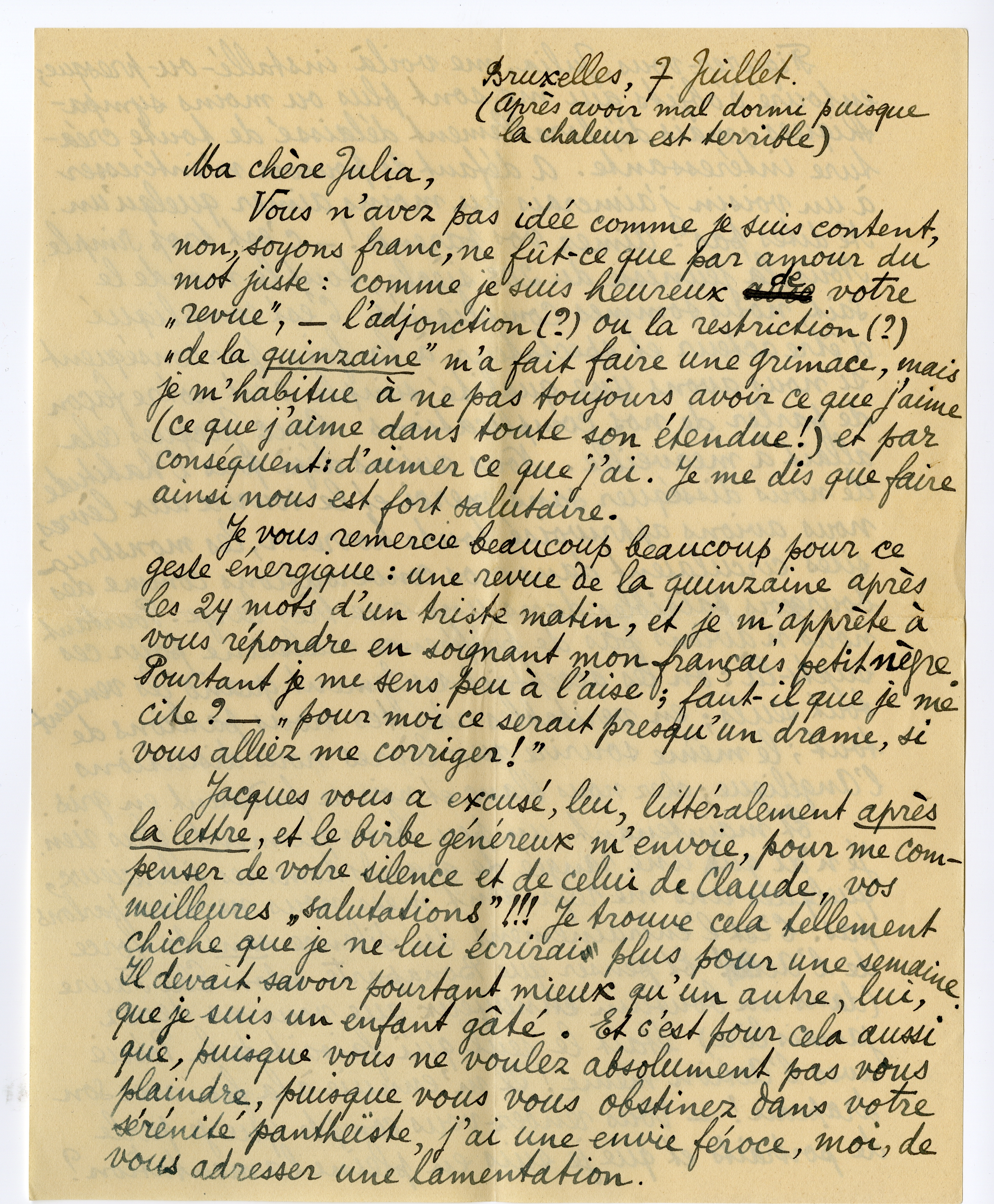 Je vous remercie beaucoup beaucoup pour ce geste énergique: une revue de la quinzaine après les 24 mots d'un triste matin, et je m'apprète à vous répondre en soignant mon français petit nègre. Pourtant je me sens peu à l'aise; faut-il que je me cite? - ‘pour moi ce serait presqu'un drame, si vous alliez me corriger!’