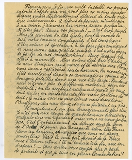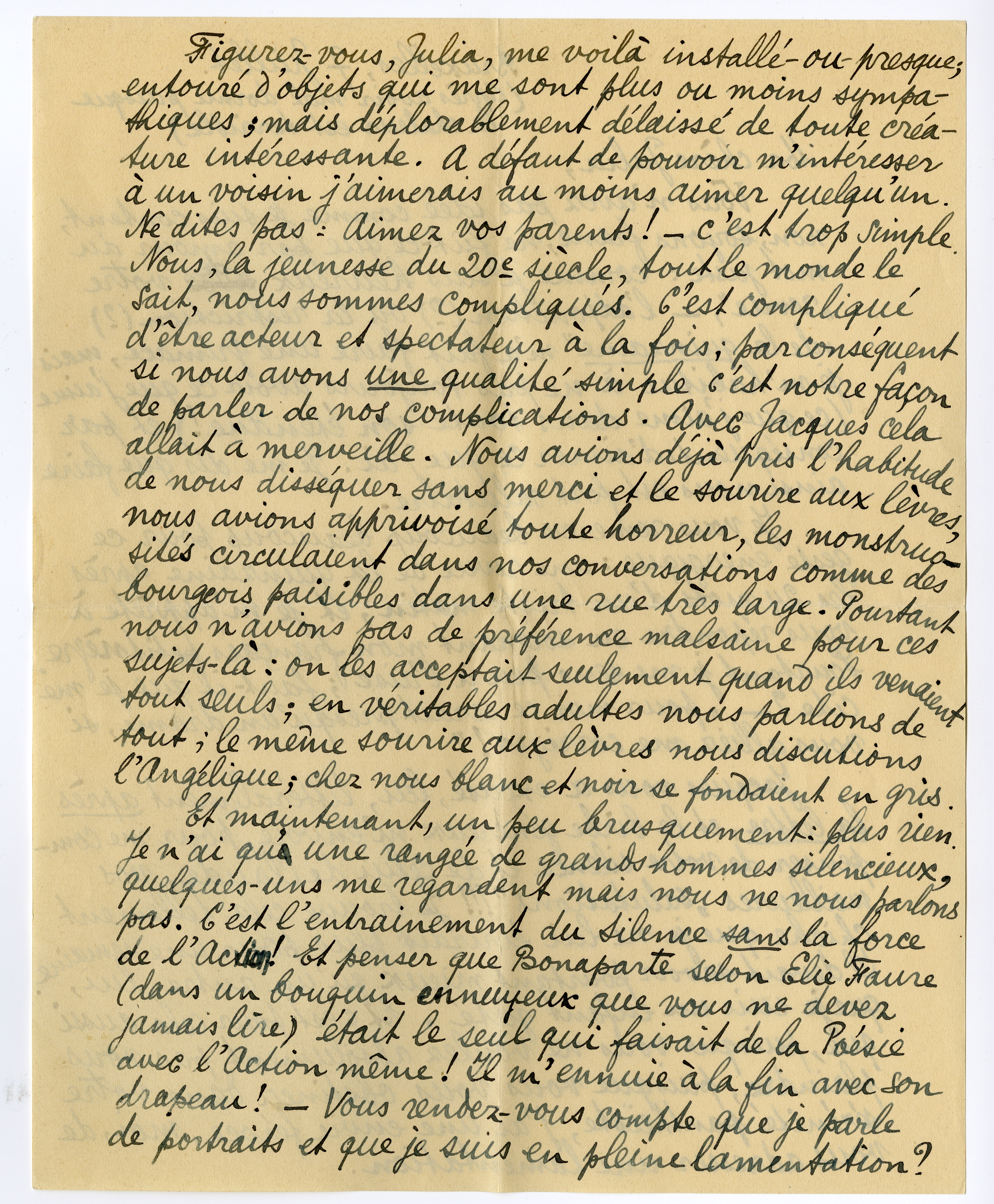 Figurez-vouz, Julia, me voilà installé-ou-presque, entouré d'objets qui me sont plus ou moins sympathiques; mais déplorablement délaissé de toute créature intéressante. A défaut de pouvoir m'intéresser à un voisin j'aimerais au moins aimer quelqu'un. Ne dites pas: Aimez vos parents! - c'est trop simple. Nous, la jeunesse du 20e siècle, tout le monde le sait, nous sommes compliqués. C'est compliqué d'être acteur et spectateur à la fois; par conséquent si nous avons une qualité simple c'est notre façon de parler de nos complications. Avec Jacques cela allait à merveille. Nous avions déjà pris l'habitude de nous disséquer sans merci et le sourire aux lèvres, nous avons apprivoisé toute horreur, les monstruosités circulaient dans nos conversations comme des bourgeois paisibles dans une rue très large. Pourtant nous n'avions pas de préférence malsaine pour ces sujets-là: on les acceptait seulement quand ils venaient tout seuls; en véritables adultes nous parlions de tout; le même sourire aux lèvres nous discutions l'Angélique; chez nous blanc et noir se fondaient en gris.