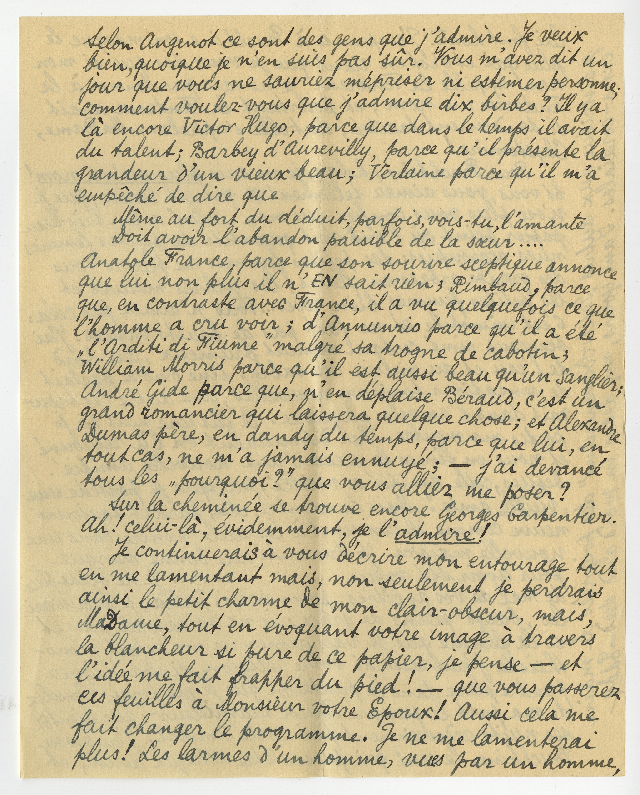 Anatole France, parce que son sourire sceptique annonce que lui non plus il n'EN sait rien; Rimbaud, parce que, en contraste avec France, il a vu quelquefois ce que l'homme a cru voir; d'Annunzio parce qu'il a été ‘l'Arditi di Fiume’ malgré sa trogne de cabotin; William Morris parce qu'il est aussi beau qu'un sanglier; André Gide parce que, n'en déplaise Béraud, c'est un grand romancier qui laissera quelque chose; et Alexandre Dumas père, en dandy du temps, parce que lui, en tout cas, ne m'a jamais ennuyé; - j'ai devancé tout les ‘pourquoi?’ que vous alliez me poser?