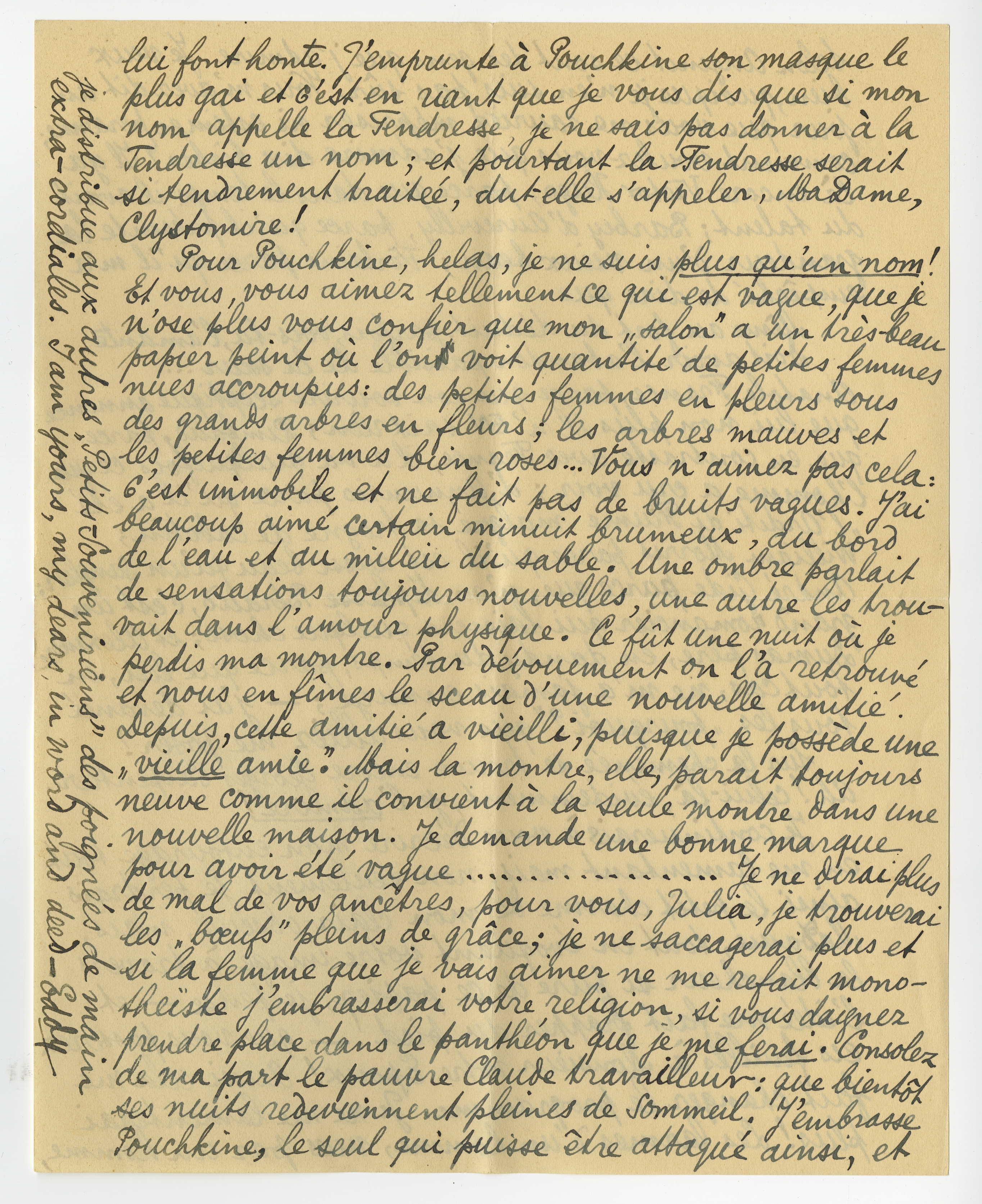 Pour Pouchkine, helas, je ne suis plus qu'un nom! Et vous, vous aimez tellement ce qui est vague, que je n'ose plus vous confier que mon ‘salon’ a un très-beau papier peint où l'on voit quantité de petites femmes nues accroupies: des petites femmes en pleurs sous des grands arbres en fleurs; les arbres mauves et les petites femmes bien roses... Vous n'aimez pas cela: c'est immobile et ne fait pas de bruits vagues. J'ai beaucoup aimé certain minuit brumeux, au bord de l'eau et au milieu du sable. Une ombre parlait de sensations toujours nouvelles, une autre les trouvait dans l'amour physique. Ce fût une nuit où je perdis ma montre. Par dévouement on l'a retrouvé et nous en fîmes le sceau d'une nouvelle amitié. Depuis, cette amitié a vieilli, puisque je possède une ‘vieille amie.’ Mais la montre, elle, parait toujours neuve comme il convient à la seule montre dans une nouvelle maison. Je demande une bonne marque pour avoir été vague... Je ne dirai plus de mal de vos ancêtres, pour vous, Julia, je trouverai les ‘boeufs’ pleins de grâce; je ne saccagerai plus et si la femme que je vais aimer ne me refait monotheïste j'embrasserai votre religion, si vous daignez prendre place dans le panthéon que je me ferai. Consolez de ma part le pauvre Claude travailleur: que bientôt ses nuits redeviennent pleines de sommeil. J'embrasse Pouchkine, le seul qui puisse être attaqué ainsi, et je distribue aux autres ‘Petits-Souveniriens’ des poigneés de main extra-cordiales. I am yours, my dears, in word and deed -