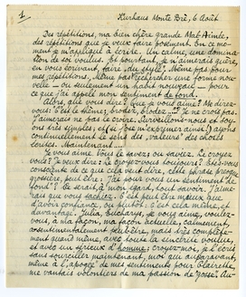 Je continue toujours. Vous allez rire à votre tour, isn't it? vous et l'épistolaire, s'il se trouve toujours là, de tout ce papier qui vous arrive - à travers les ‘reths’ (!) de mes ‘principes’. Mais c'est que, une fois commencée, j'aimerais que cette lettre soit terminée. Ou plus ou moins! Et pourtant je sais d'avance qu'elle ne le sera jamais; puisqu'elle est commencée ‘en longueur’. Le style ample, etc. - contraire du style direct. Le style épistolaire, dégagé! Vous voyez combien les modernes ont raison, en recherchant la synthése. Seulement, une lettre synthétique, c'est à peine une lettre. Que diriez-vous si je ne vous écrivais que cette seule phrase, sur beaucoup de blanc: