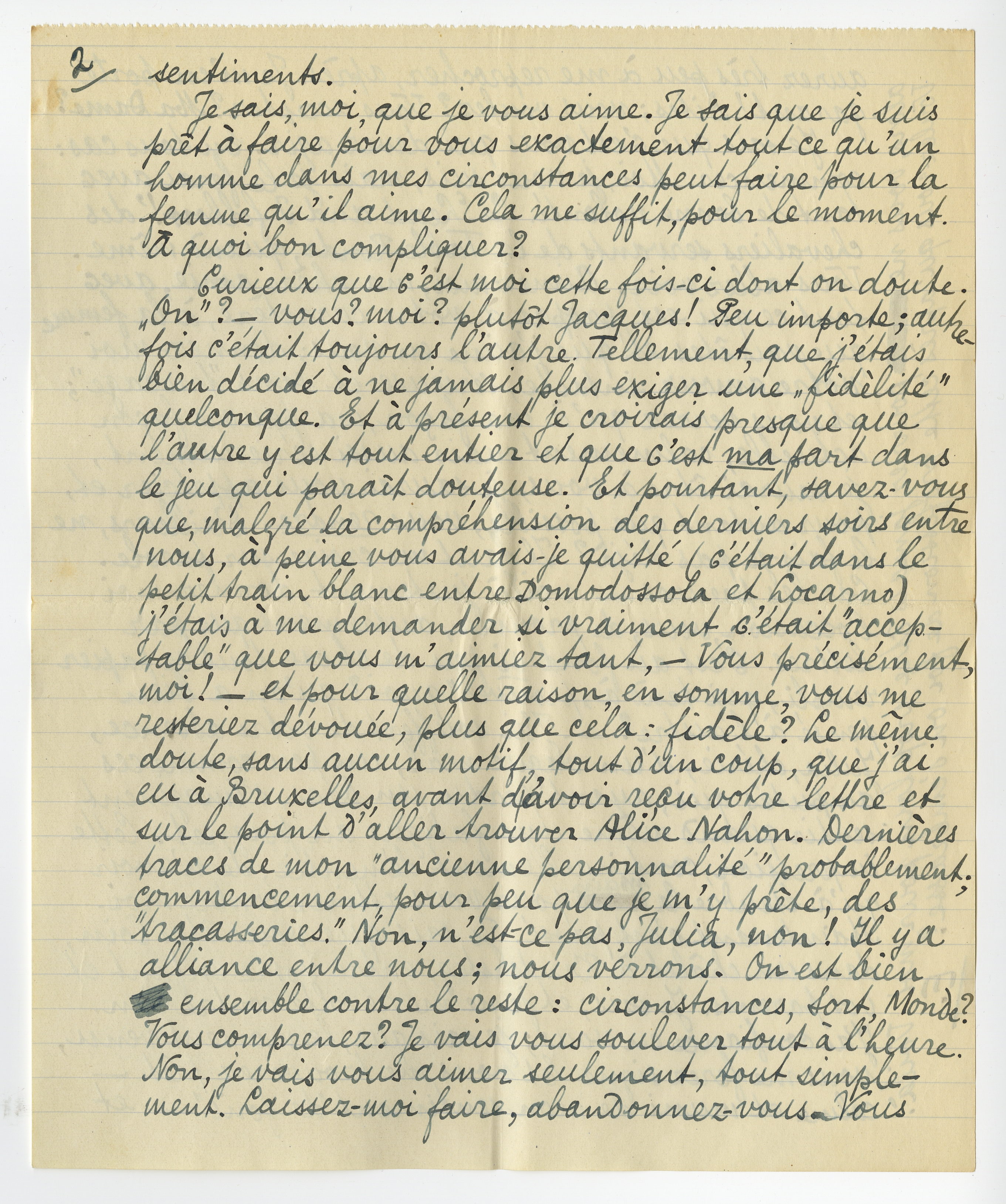 Je vous aime. Vous le savez; ou saviez. Le croyez vous? Je veux dire: Le croyez-vous toujours? Etes-vous consciente de ce que cela veut dire, cette phrase presque grossière, peut être: J'ai pour vous un sentiment ‘de fond’? Ce serait, à mon égard, tout savoir. J'aimerais que vous sachiez. C'est peut être mieux que d'avoir confiance, ou plutôt: c'est cela même, et davantage. Julia, Eucharys, je vous aime, voulez-vous, à ma façon, ma façon actuelle, calmement, a-sentimentalement peut-être, mais très complètement quand même, avec toute la sincérité voulue, at avec un sérieux d'homme; croyez-moi, je l'écris sans sourciller maintenant, moi qui auparavant, même à l'‘apogée’ de mes sentiments pour Clairette, me vantais volontiers de ma passion de ‘gosse’. Auriez vous vraiment préféré cette ancienne manière, ou - pour parler avec ce très-bien-aimant épistolaire des dialogues que vous prisiez si fort (pardonnez-moi d'écrire comme Ronsard, c'est l'épistolaire qui en est coupable) - cette ancienne ‘puissance’? Ah, l'ineptie du mot. Autrefois, je ne savais pas. L'amour, c'était pour moi: la souffrance, l'incertitude, la méfiance (cachée sous trop de mots tendres), l'analyse, et en fin de compte, les tracasseries. C'était aimer, ça, aimer grandement, noblement, je dirais presque: minutieusement, comme savent aimer seulement les âmes de luxe! Maintenant, en vous aimant, justement en Vous aimant, ma chère Julia trop peu à moi, il me semble que je sais ce que je.... veux. La phrase est beaucoup moins bête qu'elle ne le paraît; beaucoup moins positive. Elle ne se rapporte qu'à un état d'âme. Dieu, que les mots sont ridicules, surtout formulés et formés avec application: ‘blue-black’ sur blanc, encre de stylographe sur assez bon papier, assez commercial quand même.
