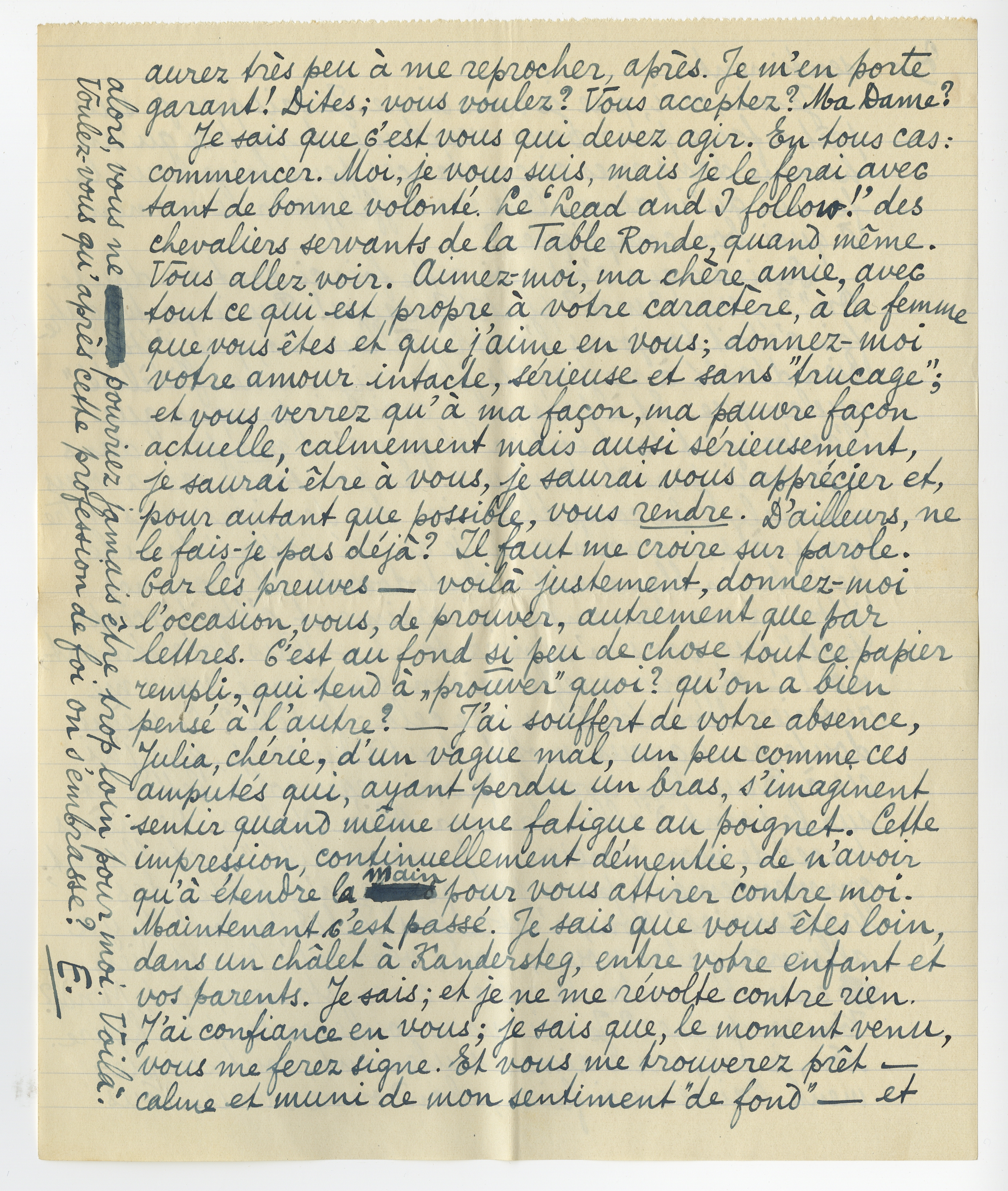 Je sais que c'est vous qui devez agir. En tous cas: commencer. Moi, je vous suis, mais je le ferai avec tant de bonne volonté. Le ‘Lead and I follow!’ des chevaliers servants de la Table Ronde, quand même. Vous allez voir. Aimez-moi, ma chère amie, avec tout ce qui est propre à votre caractère, à la femme que vous êtes et que j'aime en vous; donnez-moi votre amour intacte, sérieuse et sans ‘trucage’; et vous verrez qu'à ma façon, ma pauvre façon actuelle, calmement mais aussi sérieusement, je saurai être à vous, je saurai vous apprécier et, pour autant que possible, vous rendre. D'ailleurs, ne le fais-je pas déjà? Il faut me croire sur parole. Car les preuves - voilà justement, donnez-moi l'occasion, vous, de prouver, autrement que par lettres. C'est au fond si peu de chose tout ce papier rempli, qui tend à ‘prouver’ quoi? qu'on a bien pensé à l'autre? - J'ai souffert de votre absence, Julia, chérie, d'un vague mal, un peu comme ces amputés qui, ayant perdu un bras, s'imaginent sentir quand même une fatigue au poignet. Cette impression, continuellement démentie, de n'avoir qu'à étendre la main pour vous attirer contre moi. Maintenant c'est passé. Je sais que vous êtes loin, dans un châlet à Kandersteg, entre votre enfant et vos parents. Je sais; et je ne me révolte contre rien. J'ai confiance en vous; je sais que, le moment venu, vous me ferez signe. Et vous me trouverez prêt - calme et muni de mon sentiment ‘de fond’ - et alors, vous ne pourriez jamais être trop loin pour moi. Voilà. Voulez-vous qu'après cette profession de foi on s'embrasse?