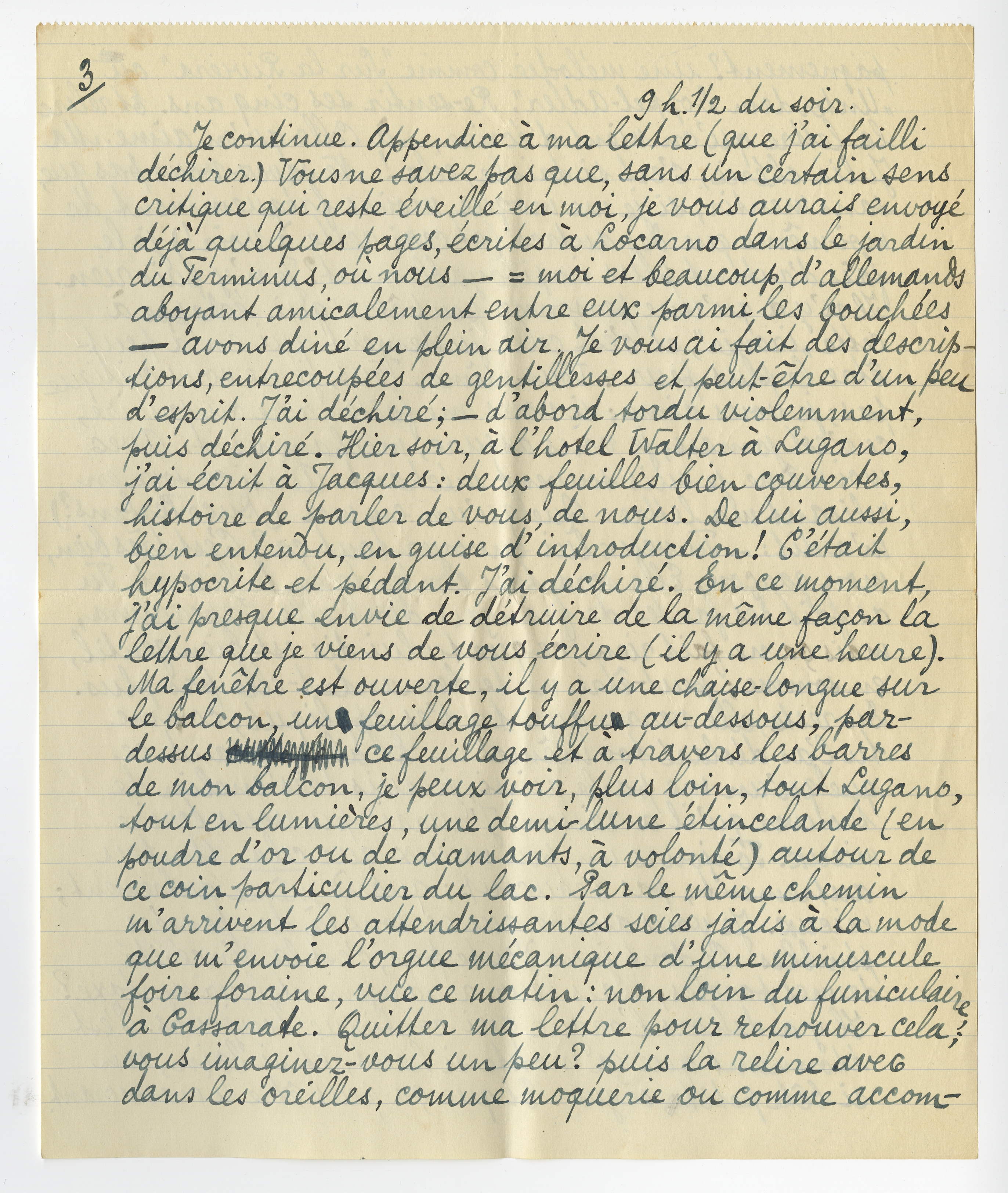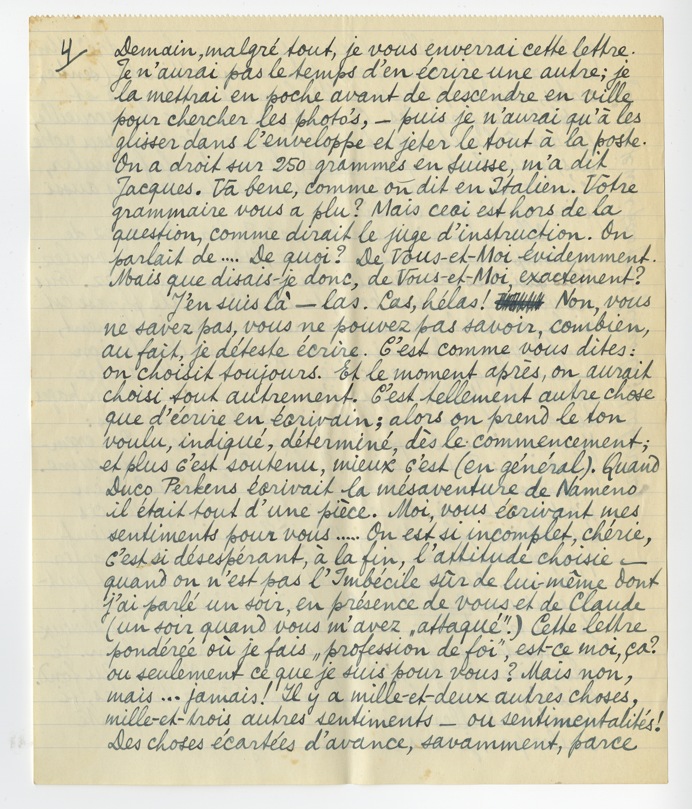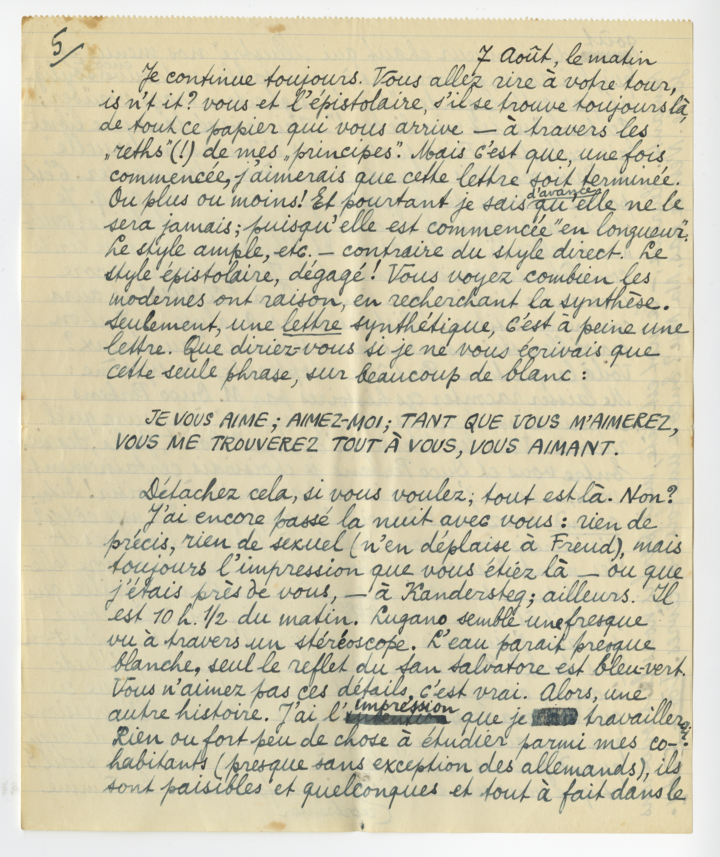 J'ai encore passé la nuit avec vous: rien de précis, rien de sexuel (n'en déplaise à Freud), mais toujours l'impression que vous étiez là - ou que j'étais près de vous, - à Kandersteg; ailleurs. Il est 10 h.1/2 du matin. Lugano semble une fresque vu à travers un stéréoscope. L'eau parait presque blanche, seul le reflet du San Salvatore est bleu-vert. Vous n'aimez pas ces détails, c'est vrai. Alors, une autre histoire. J'ai l'impression que je travaillerai. Rien ou fort peu de chose à étudier parmi mes cohabitants (presque sans exception des allemands), ils sont paisibles et quelconques et tout à fait dans le goût du monsieur chauf qui ‘illustre’ nos menus et qui, lui aussi, se trouvant à une table, se trouve encore souligné par cette légende: ‘Die Süssigkeiten tragt vorüber; Gerber-käse ist mir lieber!’ - J'ai trouvé dans une librairie (celle de M. Faist, justement) l'Inversion Sexuelle de Havelock Ellis et me suis mis à me documenter. C'est pour l'histoire de la femme en présence des cinq. Je choisis mes types et ai déjà fait des annotations; seulement, celles-ci sont claires et l'histoire doit être écrite complètement en sous-entendu. Je veux écrire encore une autre histoire qui s'intitulera ‘CLAUDIA’ et aura comme sous-titre: Histoire sans Analyse. - Peut-on travailler sérieusement sans se prendre au sérieux? Voilà la question. Peut-être adopterai-je ce système: Me laisser raconter ces histoires par M. Duco Perkens et pour ainsi dire, les ‘sténographier’ à mesure qu'il raconte. Vous les détestez d'avance? Don't, Julia, dearie. Entre vous et Duco Perkens je choisirais certainement vous, - mais j'aimerais ne pas avoir à choisir! Dites: quand serez-vous à moi? Le compagnon? à mes côtés? J'aimerais tant vous piloter à travers des choses et des ‘mondes’ inconnus. Vouz avez le regard encore tellement pur, peu usé et en même temps tranquille que ça doit être un plaisir à part de vous ‘voir voir’. Ne croyez pas que j'aimerais vous èxposer; d'ailleurs ne sera-t-on pas deux? Passer par le calme, la passion, l'étude à deux; aimeriez-vous? Et pourtant je crois que ce qui me sera le plus cher c'est de retrouver l'expression que vous aviez, une après-midi, dans la chambre de Jacques, quand je vous voyais tour à tour de face et de profil et que vous me sembliez représenter si parfaitement la Femme Aimante. Heureuse, - le mot est bête, mais parfois nous le trouverons juste. N'est-ce pas, Ma Mye? Encore une fois vos lèvres.