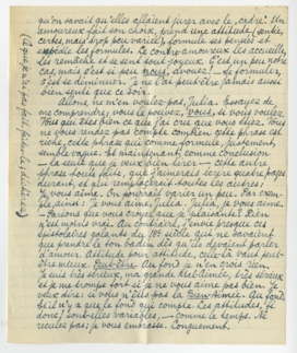 Maintenant j'aimerais traîter toutes ces attitudes périmées, ces brins de rôles, chipés à quelques fameux romans, - des Scènes de la Vie de Bohème jusqu'aux exigences fatales du type ‘héros’ plus moderne (Nameno par exemple) - j'aimerais les traiter avec un mépris pourtant doux et souriant, de niaiseries, embrouillements, falsifications. Et vous ne voulez pas être ‘d'accord’? Je suis sûr que oui, ma chère Julia. Vous devez avoir, quand même, ce calme intérieur; vous qui l'avez si souvent extérieurement. Ce beau calme qui, justement, ne déforme pas les sentiments.