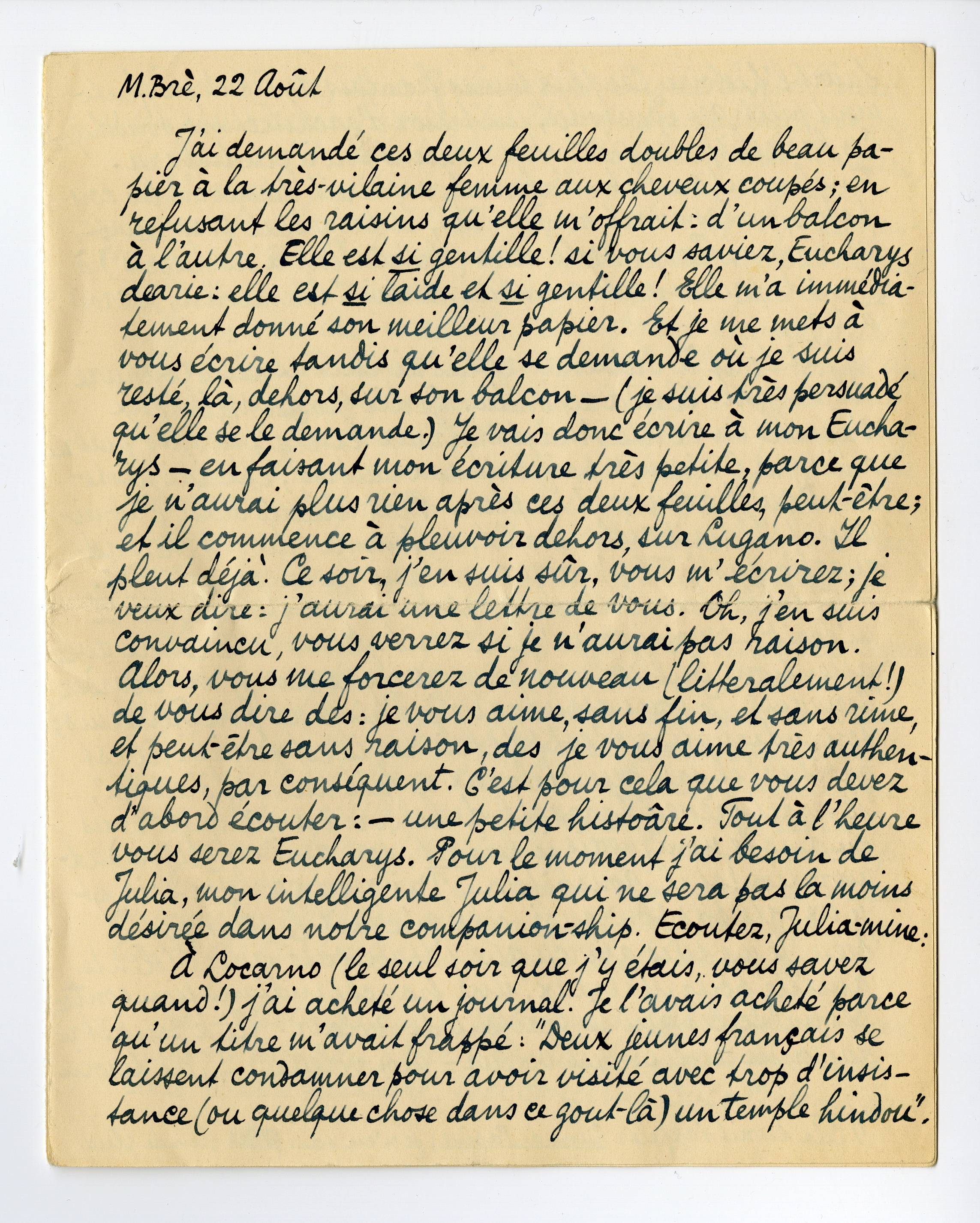 J'ai demandé ces deux feuilles doubles de beau papier à la très-vilaine femme aux cheveux coupés; en refusant les raisins qu'elle m'offrait: d'un balcon à l'autre. Elle est si gentille! si vous saviez, Eucharys dearie: elle est si laide et si gentille! Elle m'a immédiatement donné son meilleur papier. Et je me mets à vous écrire tandis qu'elle se demande où je suis resté, là, dehors, sur son balcon - (je suis très persuadé qu'elle se le demande.) Je vais donc écrire à mon Eucharys - en faisant mon écriture très petite, parce que je n'aurai plus rien après ces deux feuilles, peut-être; et il commence à pleuvoir dehors, sur Lugano. Il pleut déjà. Ce soir, j'en suis sûr, vous m'écrirez; je veux dire: j'aurai une lettre de vous. Oh, j'en suis convaincu, vous verrez si je n'aurai pas raison. Alors, vous me forcerez de nouveau (litteralement!) de vous dire des: je vous aime, sans fin, et sans rime, et peut-être sans raison, des je vous aime très authentiques, par conséquent. C'est pour cela que vous devez d'abord écouter: - une petite histoâre. Tout à l'heure vous serez Eucharys. Pour le moment j'ai besoin de Julia, mon intelligente Julia qui ne sera pas la moins désirée dans notre companion-ship. Ecoutez, Julia-mine: