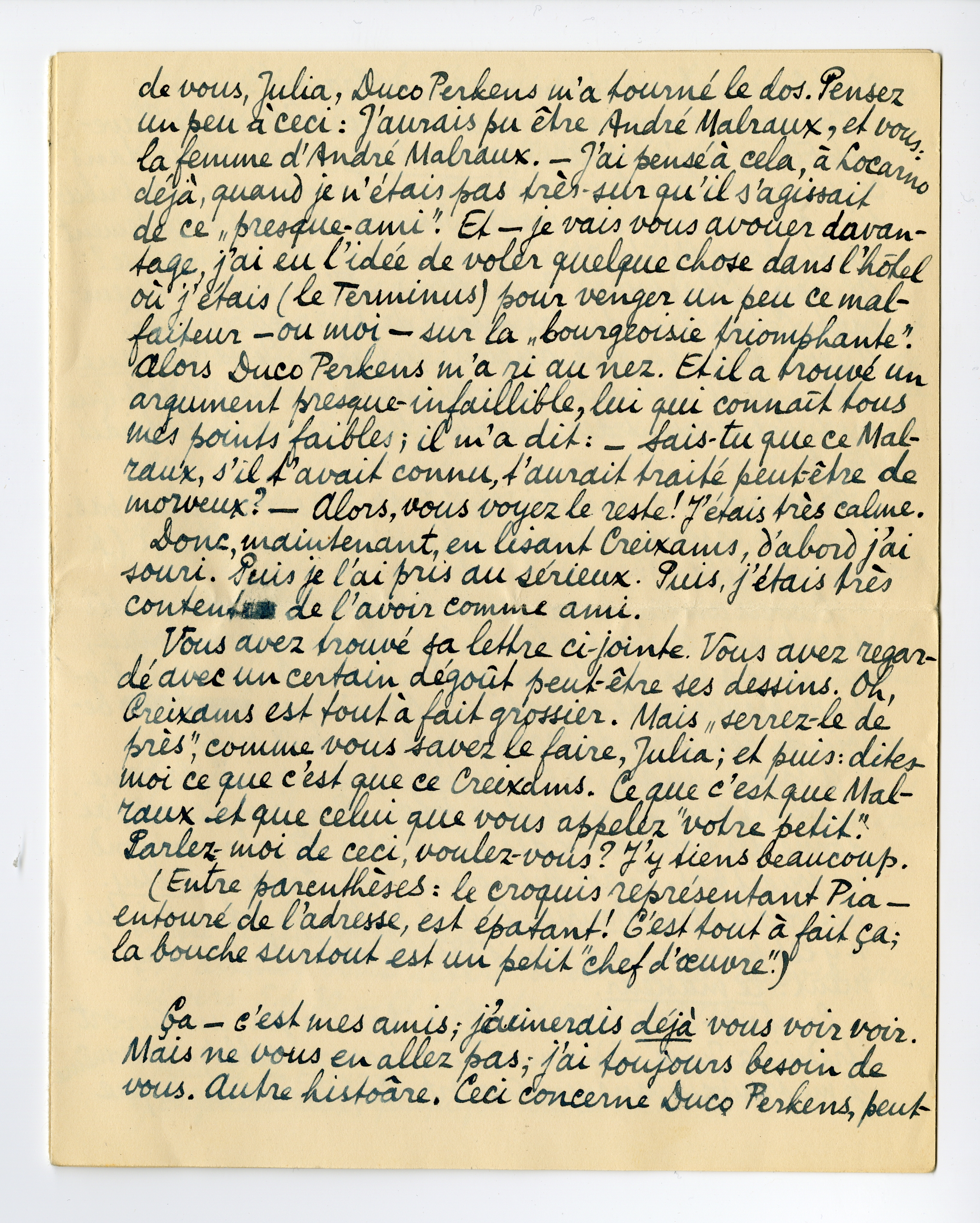 Vous avez trouvé sa lettre ci-jointe. Vous avez regardé avec un certain dégoût peut-être ses dessins. Oh, Creixams est tout à fait grossier. Mais ‘serrez-le de près’, comme vous savez le faire, Julia; et puis: dites-moi ce que c'est que ce Creixams. Ce que c'est que Malraux et que celui que vous appelez ‘votre petit’. Parlez-moi de ceci, voulez-vous? J'y tiens beaucoup.
