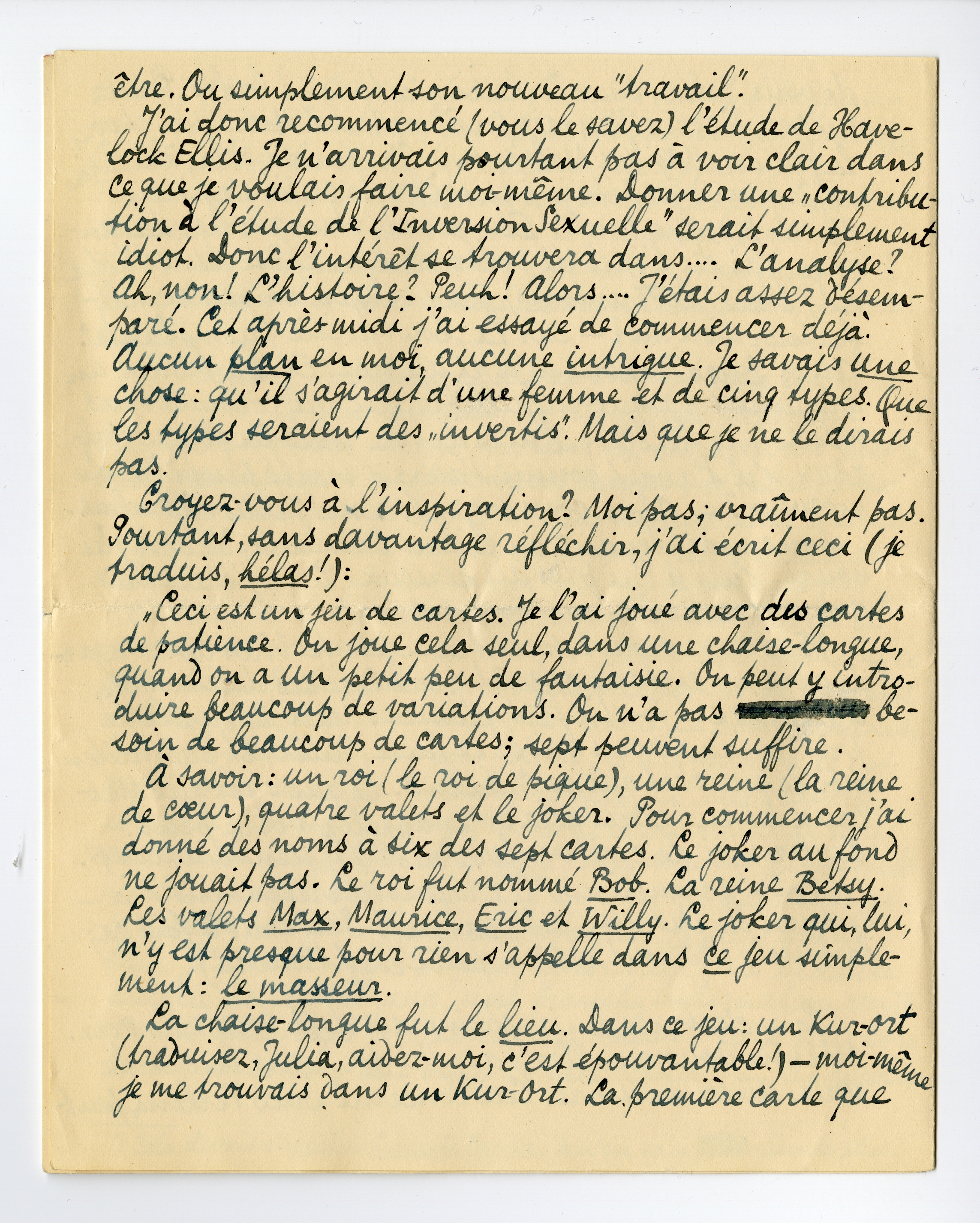 J'ai donc recommencé (vous le savez) l'étude de Havelock Ellis. Je n'arrivais pourtant pas à voir clair dans ce que je voulais faire moi-même. Donner une ‘contribution à l'étude de l'Inversion Sexuelle serait simplement idiot. Donc l'intérêt se trouvera dans.... L'analyse? Ah, non! L'histoire? Peuh! Alors.... J'étais assez désemparé. Cet après-midi j'ai essayé de commencer déjà. Aucun plan en moi, aucune intrigue. Je savais une chose: qu'il s'agirait d'une femme et de cinq types. Que les types seraient des ‘invertis’. Mais que je ne le dirais pas.