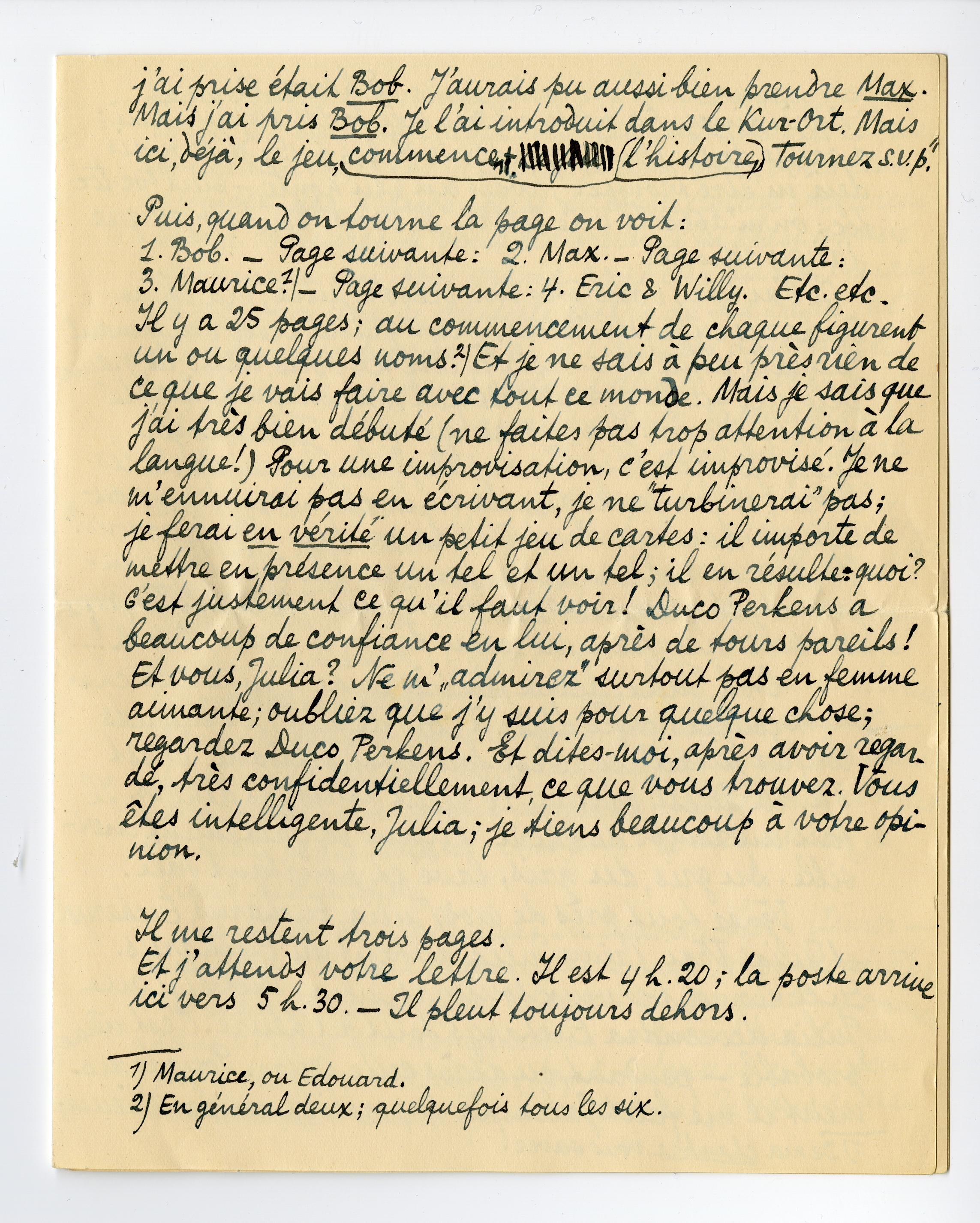 1. Bob. - Page suivante: 2. Max. - Page suivante: 3. Maurice.13 - Page suivante: 4. Eric & Willy. Etc. etc. Il y a 25 pages; au commencement de chaque figurent un ou quelques noms.14 Et je ne sais à peu près rien de ce que je vais faire avec tout ce monde. Mais je sais que j'ai très bien débuté (ne faites pas trop attention à la langue!) Pour une improvisation, c'est improvisé. Je ne m'ennuirai pas en écrivant, je ne ‘turbinerai’ pas; je ferai en vérité un petit jeu de cartes: il importe de mettre en présence un tel et un tel; il en résulte: quoi? c'est justement ce qu'il faut voir! Duco Perkens a beaucoup de confiance en lui, après de tours pareils! Et vous, Julia? Ne m'‘admirez’ surtout pas en femme aimante; oubliez que j'y suis pour quelque chose; regardez Duco Perkens. Et dites-moi, après avoir regardé, très confidentiellement, ce que vous trouvez. Vous êtes intelligente, Julia; je tiens beaucoup à votre opinion.