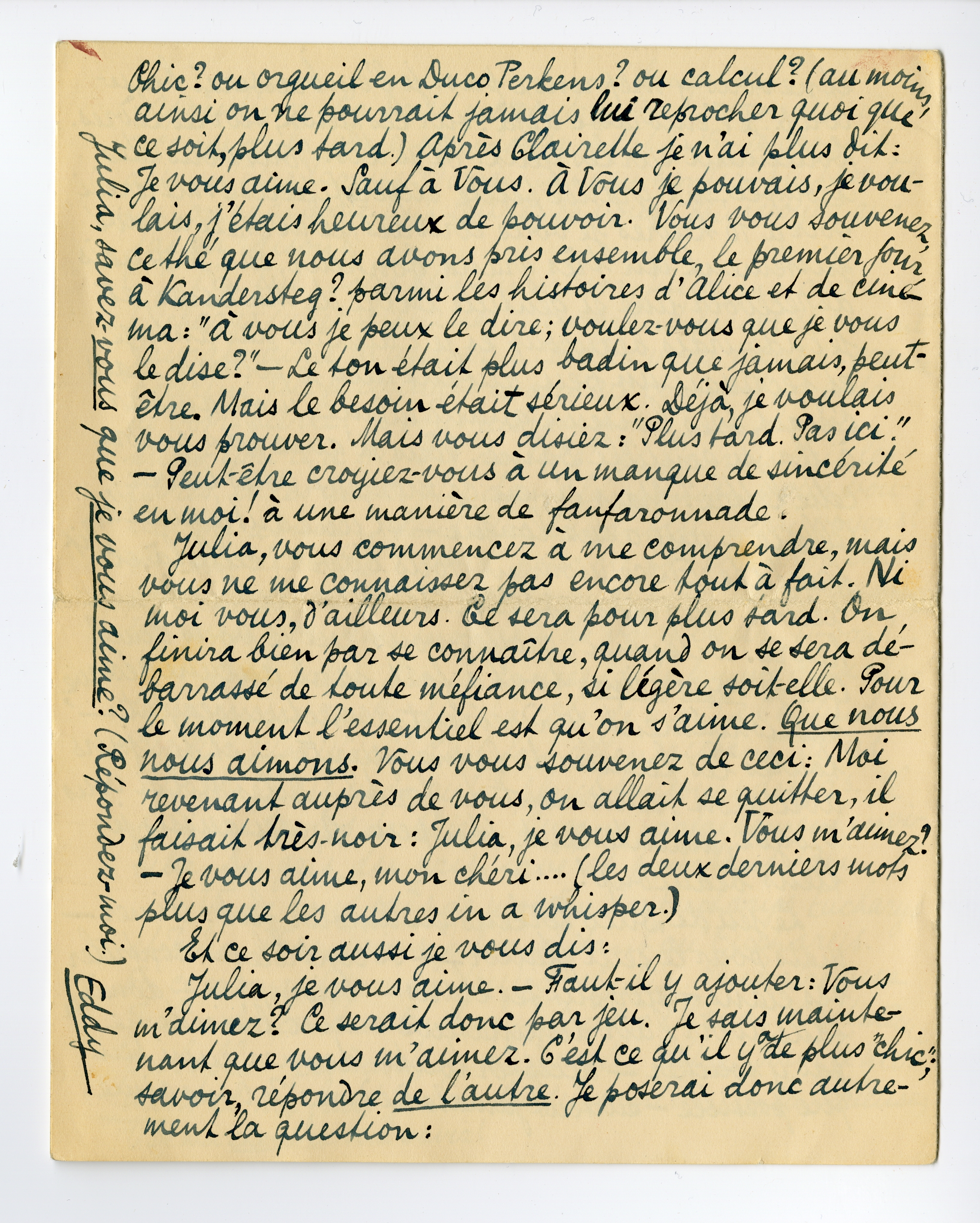 Julia, vous commencez à me comprendre, mais vous ne me connaissez pas encore tout à fait. Ni moi vous, d'ailleurs. Ce sera pour plus tard. On finira bien par se connaître, quand on se sera débarassé de toute méfiance, si légère soit-elle. Pour le moment l'essentiel est qu'on s'aime. Que nous nous aimons. Vous vous souvenez de ceci: Moi revenant auprès de vous, on allait se quitter, il faisait très-noir: Julia, je vous aime. Vous m'aimez? - Je vous aime, mon chéri.... (les deux derniers mots plus que les autres in a whisper.)