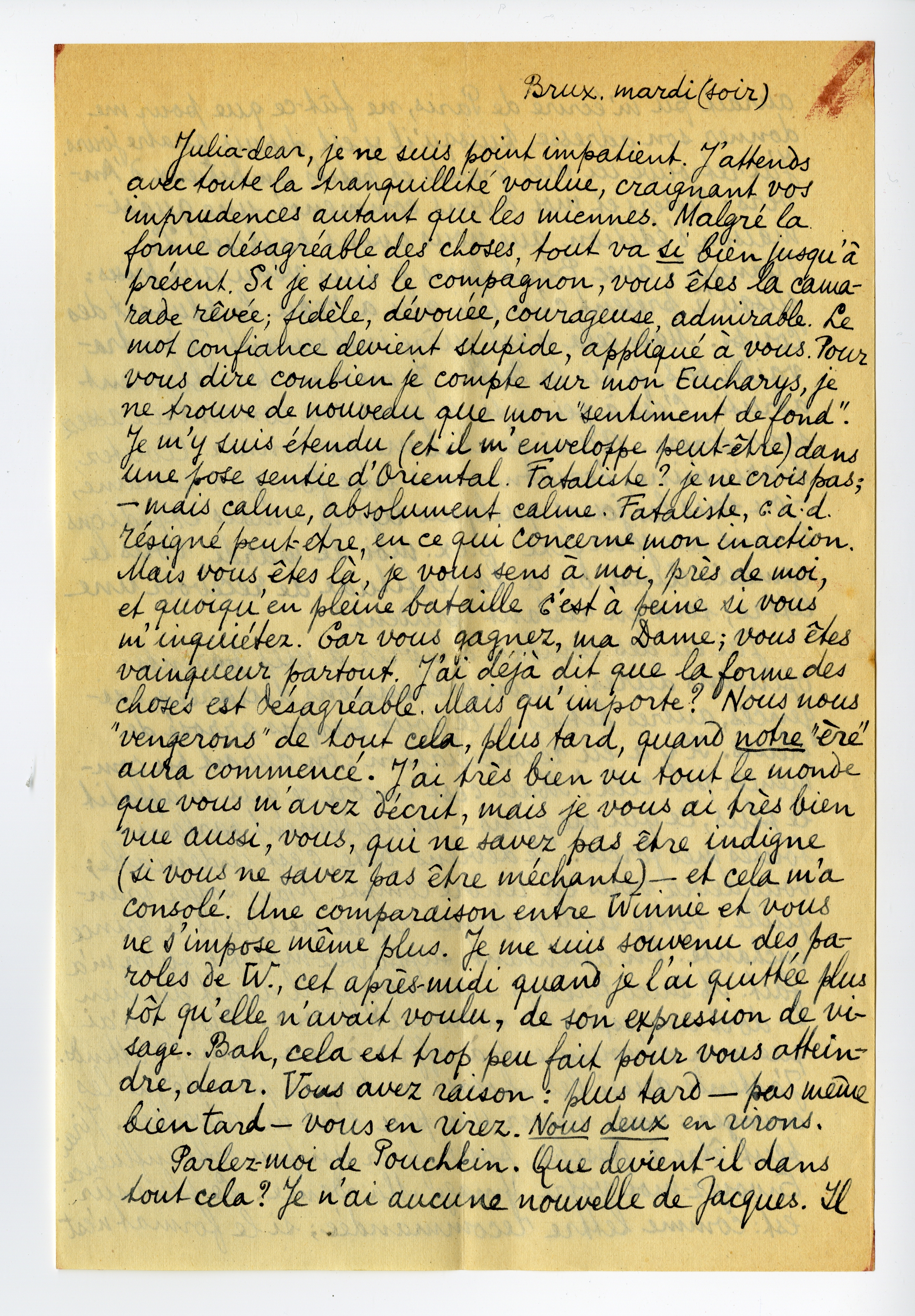 Julia-dear, je ne suis point impatient. J'attends avec toute la tranquillité voulue, craignant vos imprudences autant que les miennes. Malgré la forme désagréable des choses, tout va si bien jusqu'à présent. Si je suis le compagnon, vous êtes la camarade rêvée; fidèle, dévouvée, courageuse, admirable. Le mot confiance devient stupide, appliqué à vous. Pour vous dire combien je compte sur mon Eucharys, je ne trouve de nouveau que mon ‘sentiment de fond’. Je m'y suis étendu (et il m'enveloppe peut-être) dans une pose sentie d'Oriental. Fataliste? je ne crois pas; - mais calme, absolument calme. Fataliste, c.à.d. résigné peut-être, en ce qui concerne mon inaction. Mais vous êtes là, je vous sens à moi, près de moi, et quoiqu'en pleine bataille c'est à peine si vous m'inquiétez. Car vous gagnez, ma Dame; vous êtes vainqueur partout. J'ai déjà dit que la forme des choses est désagréable. Mais qu'importe? Nous nous ‘vengerons’ de tout cela, plus tard, quand notre ‘ère’ aura commencé. J'ai très bien vu tout le monde que vous m'avez décrit, mais je vous ai très vue aussi, vous, qui ne savez pas être indigne (si vous ne savez pas être méchante) - et cela m'a consolé. Une comparaison entre Winnie et vous ne s'impose même plus. Je me suis souvenu des paroles de W., cet après-midi quand je l'ai quittée plus tôt qu'elle n'avait voulu, de son expression de visage. Bah, cela est trop peu faite pour vous atteindre, dear. Vous avez raison: plus tard - pas même bien tard - vous en rirez. Nous deux en rirons.