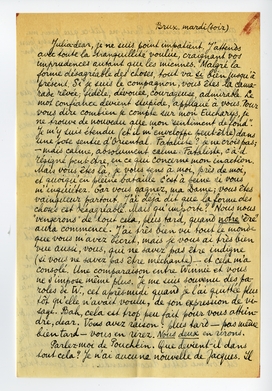 Parlez-moi de Pouchkin. Que devient-il dans tout cela? Je n'ai aucune nouvelle de Jacques. Il aurait pu m'écrire de Paris, ne fût-ce que pour me donner son adresse, puisqu'il y est depuis quatre jours. J'ai retrouvé ici mes grands et petits ambitieux d'Anvers: Peeters et moi avons commencé une quasi-maison d'édition que nous avons baptisée Le Triangle; avec Berckelaers je suis venu aux prises: jusqu'à présent c'est lui qui a reçu la plupart des coups. Mais cela n'est guère intéressant. Je ne travaille pas; je lis la Bible. Je me sens terriblement abruti. C'est à peine si je peux me concentrer assez pour écrire. Aussi faut-il me pardonner. Ecoutez, dearie-mine, écrivons-nous une fois par semaine, - ou tous les jours quelques lignes - mais expédions le tout un jour fixe: p. ex. moi le mardi, vous le samedi. Ainsi on a la certitude de recevoir une lettre, tout en restant ‘prudent’.