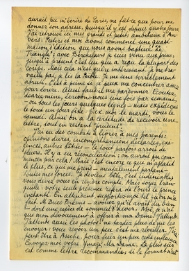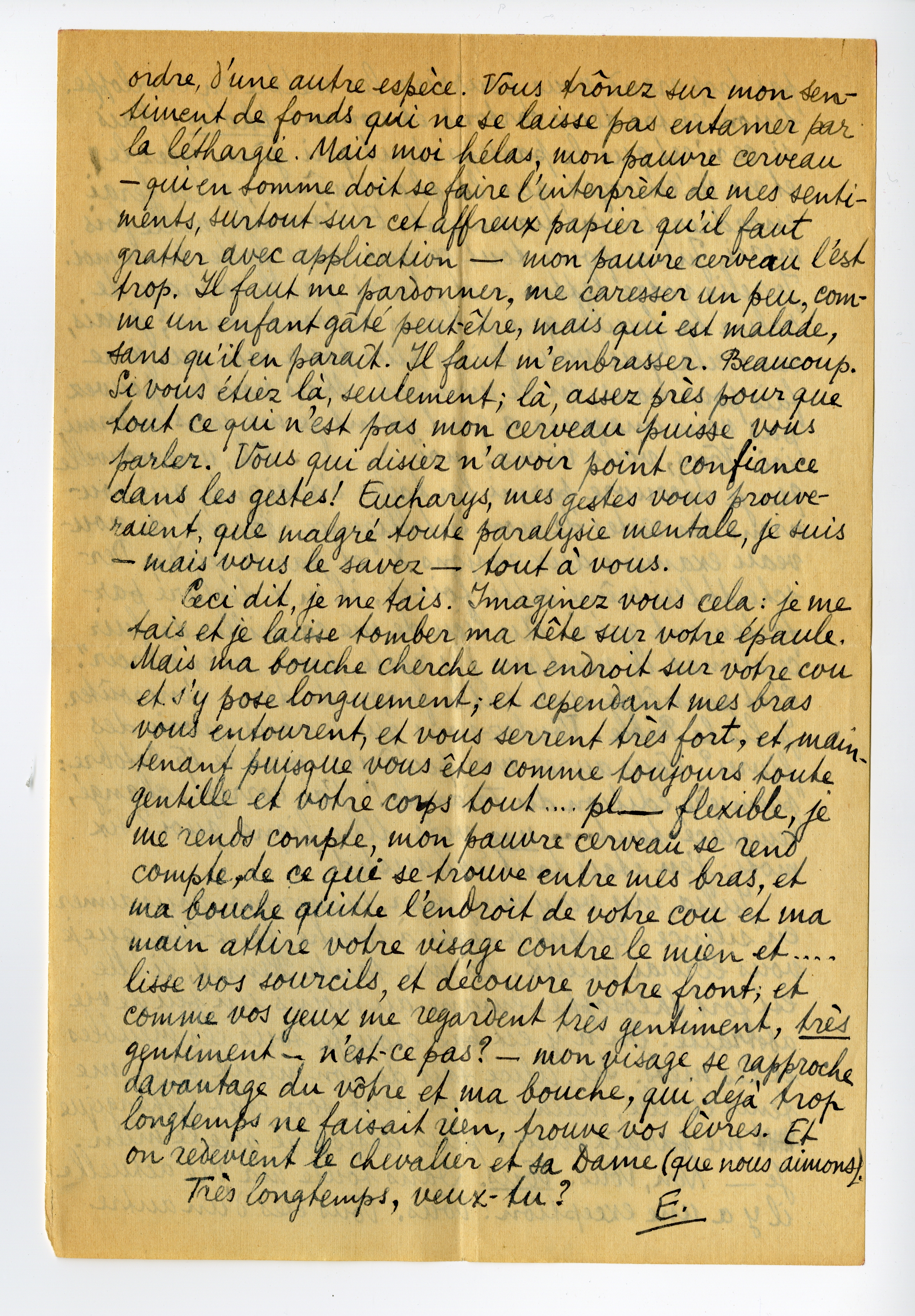Ceci dit, je me tais. Imaginez vous cela: je me tais et je laisse tomber ma tête sur votre épaule. Mais ma bouche cherche un endroit sur votre cou et s'y pose longuement; et cependant mes bras vous entourent, et vous serrent très fort, et maintenant puisque vous êtes comme toujours toute gentille et votre corps tout.... pl--- flexible, je me rends compte, mon pauvre cerveau se rend compte, de ce qui se trouve entre mes bras, et ma bouche quitte l'endroit de votre cou et ma main attire votre visage contre le mien et.... lisse vos sourcils, et découvre votre front; et comme vos yeux me regardent très gentiment, très gentiment - n'est-ce pas? - mon visage se rapproche davantage du vôtre et ma bouche, qui déjà trop longtemps ne faisait rien, trouve vos lèvres. Et on redevient le chevalier et sa Dame (que nous aimons).