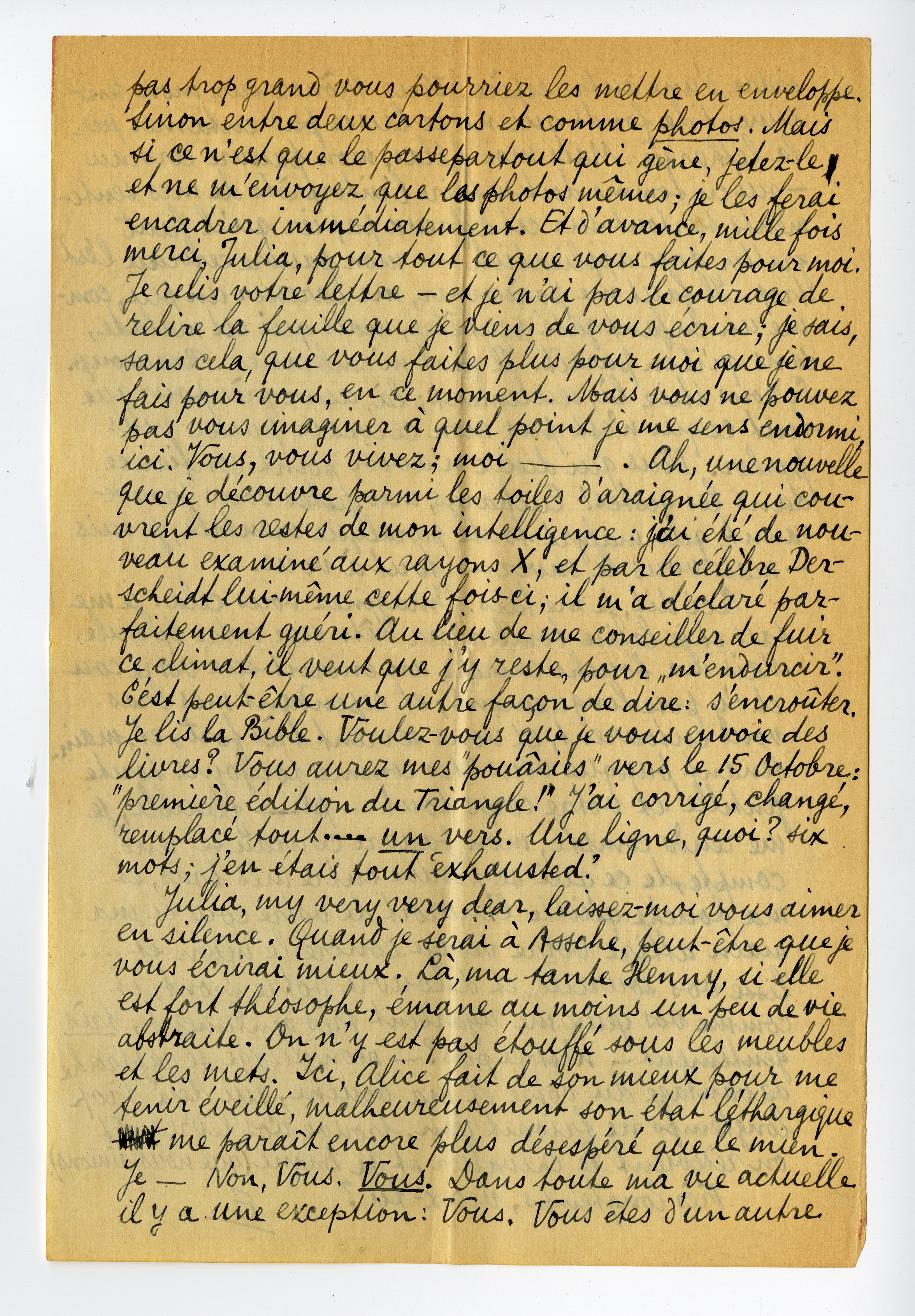 J'ai eu des combats à livrer à mes parents: opinions dures, incompréhensions déclarées, exigences, autres bêtises - le tout parfois arrosé de pleurs. Il y a eu réconciliation: on aurait pu commencer par cela! Mais c'est encore ce qui m'aplatit le plus, ce qui me prend - mentalement parlant - toutes mes forces. Je deviens bête, c'est indéniable; vous devez vous en rendre compte. Mais soyez tranquille: votre seule présence refera de l'ours le prince enchanté. En attendant, supportez-moi tel qu'on m'a fait. M. Duco Perkens - avouez qu'il avait du bien - dort une espèce de sommeil d'hiver. Moi, je n'ai que mon dévouement à offrir à ma Dame. J'attends. J'attends aussi les photos: ne tardez plus de me les envoyer: vous revoir un peu c'est me réveiller. J'irai peut-être à Assche, pour fuir un peu cette influence. Envoyez-moi votre Ymage, Ma Dame. Le plus sûr est: comme lettre recommandée; si le format n'est pas trop grand vous pourriez les mettre en enveloppe. Sinon entre deux cartons et comme photos. Mais si ce n'est que le passepartout qui gène, jetez-le et ne m'envoyez que les photos mêmes; je les ferai encadrer immédiatement. Et d'avance, mille fois merci, Julia, pour tout ce que vous faites pour moi. Je relis votre lettre - et je n'ai pas le courage de relire la feuille que je viens de vous écrire; je sais, sans cela, que vous faites plus pour moi que je ne fais pour vous, en ce moment. Mais vous ne pouvez pas vous imaginer à quel point je me sens endormi, ici. Vous, vous vivez; moi ---. Ah, une nouvelle que je découvre parmi les toiles d'araignée qui couvrent les restes de mon intelligence: j'ai été de nouveau examiné aux rayons X, et par le célèbre Derscheidt lui-même cette fois-ci; il m'a déclaré parfaitement guéri. Au lieu de me conseiller de fuir ce climat, il veut que j'y reste, pour ‘m'endurcir’. C'est peut-être une autre façon de dire: s'encroûter. Je lis la Bible. Voulez-vous que je vous envoie des livres? Vous aurez mes ‘pouâsies’ vers le 15 Octobre: ‘première édition du Triangle!’ J'ai corrigé, changé, remplacé tout.... un vers. Une ligne, quoi? six mots; j'en étais tout ‘exhausted’.