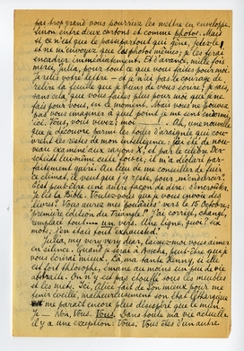 Julia, my very very dear, laissez-moi vous aimer en silence. Quand je serai à Assche, peut-être que je vous écrirai mieux. Là, ma tante Henny, si elle est fort théosophe, émane au moins un peu de vie abstraite. On n'y est pas étouffé sous les meubles et les mets. Ici, Alice fait de son mieux pour me tenir éveillé, malheureusement son état léthargique me paraît encore plus désespéré que le mien. Je - Non, Vous. Vous. Dans toute ma vie actuelle il y a une exception: Vous. Vous êtes d'un autre ordre, d'une autre espèce. Vous trônez sur mon sentiment de fonds qui ne se laisse pas entamer par la léthargie. Mais moi hélas, mon pauvre cerveau - qui en somme doit se faire l'interprète de mes sentiments, surtout sur cet affreux papier qu'il faut gratter avec application - mon pauvre cerveau l'est trop. Il faut me pardonner, me caresser un peu, comme un enfant gâté peut-être, mais qui est malade, sans qu'il en paraît. Il faut m'embrasser. Beaucoup. Si vous étiez là, seulement; là, assez près pour que tout ce qui n'est pas mon cerveau puisse vous parler. Vous qui disiez n'avoir point confiance dans les gestes! Eucharys, mes gestes vous prouveraient, que malgré toute paralysie mentale, je suis - mais vous le savez - tout à vous.
