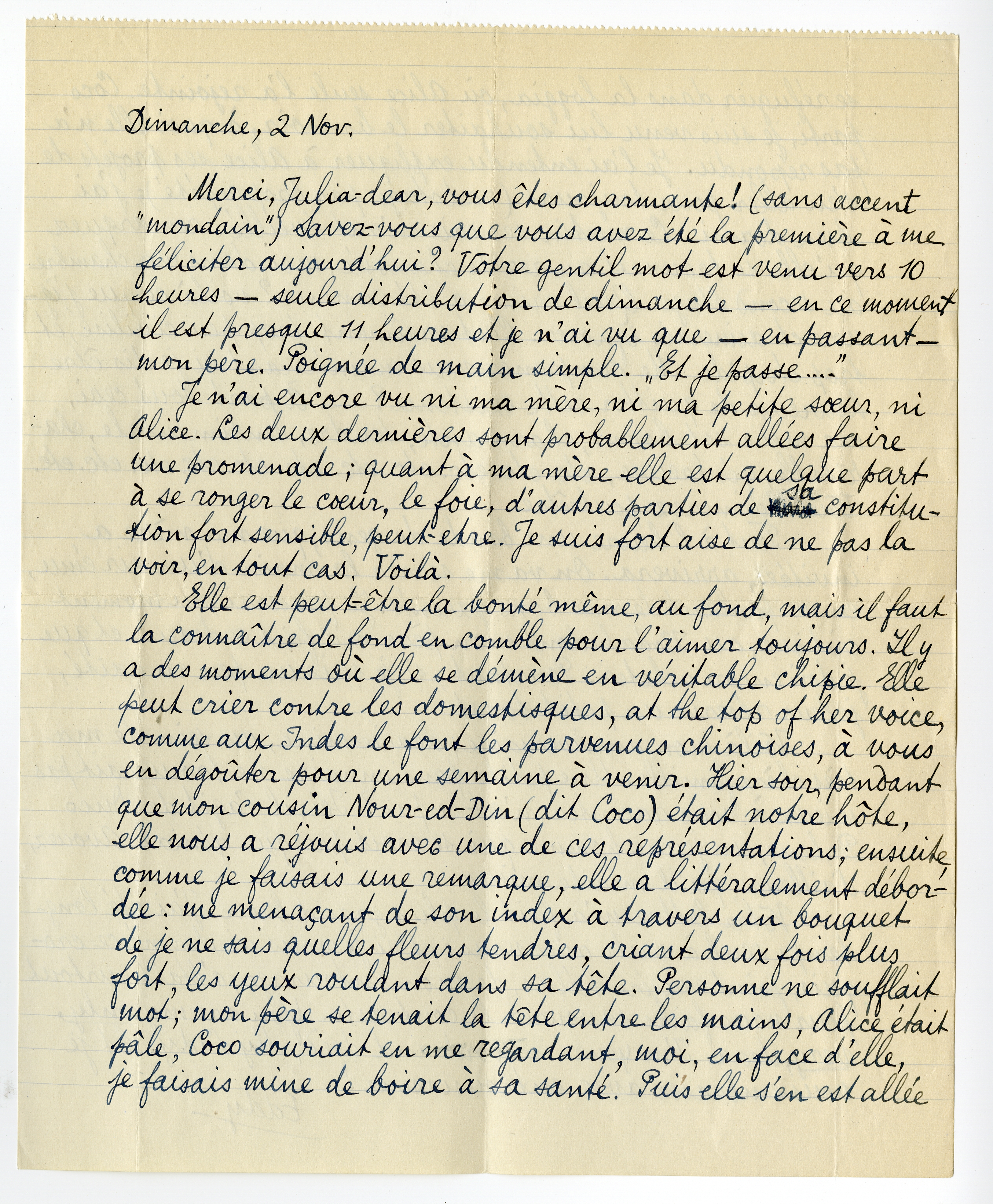 Merci, Julia-dear, vous-êtes charmante! (sans accent ‘mondain’) Savez-vous que vous avez été la première à me féliciter aujourd'hui? Votre gentil mot est venu vers 10 heures - seule distribution de dimanche - en ce moment il est presque 11 heures et je n'ai vu que - en passant - mon père. Poignée de main simple. ‘Et je passe....’