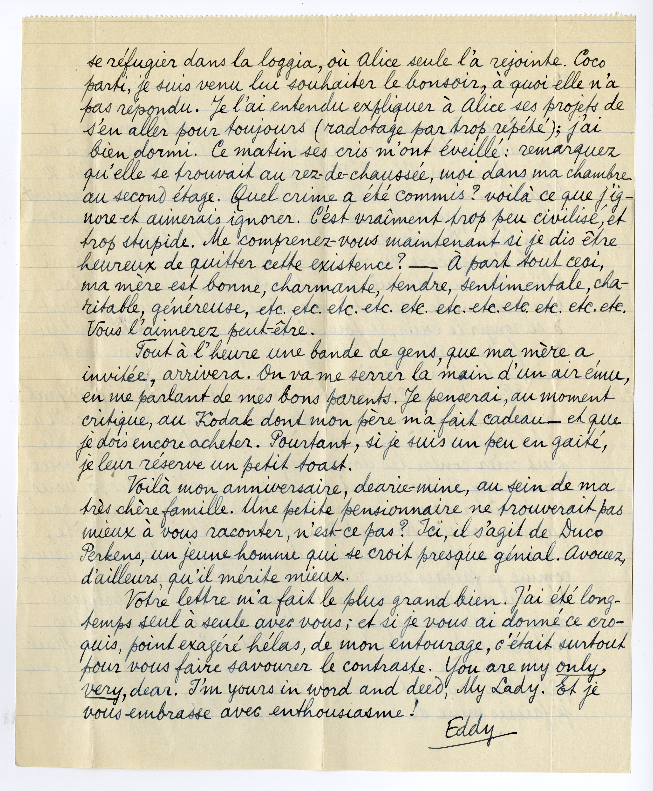 Voilà mon anniversaire, dearie-mine, au sein de ma très chère famille. Une petite pensionnaire ne trouverait pas mieux à vous raconter, n'est-ce pas? Ici, il s'agit de Duco Perkens, un jeune homme qui se croit presque génial. Avouez, d'ailleurs, qu'il mérite mieux.