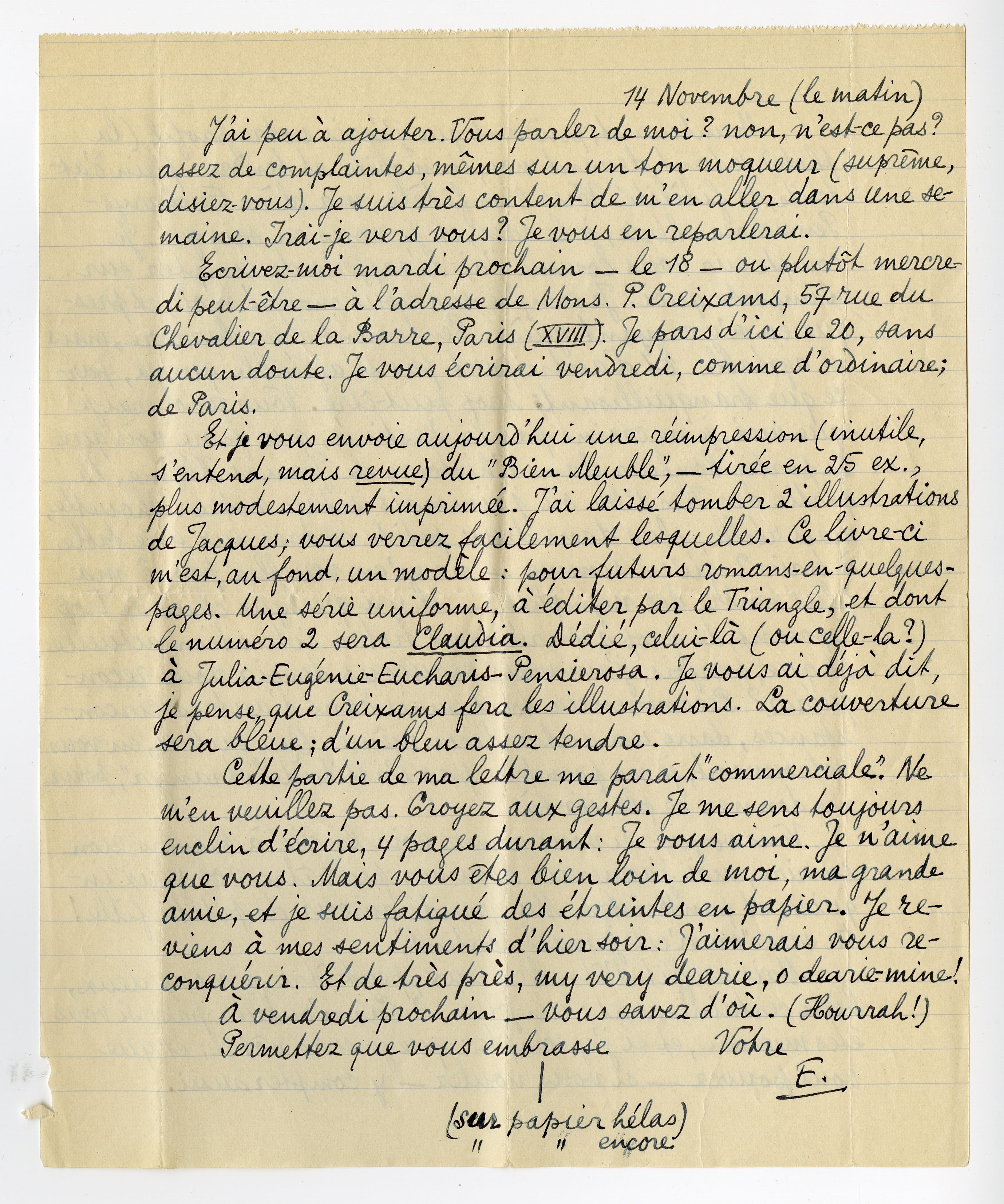 Et je vous envoie aujourd'hui une réimpression (inutile, s'entend, mais revue) du ‘Bien Meuble’, - tirée en 25 ex., plus modestement imprimée. J'ai laissé tomber 2 illustrations de Jacques; vous verrez facilement lesquelles. Ce livre-ci m'est, au fond, un modèle: pour futurs romans-en-quelques-pages. Une série uniforme, à éditer par le Triangle, et dont le numéro 2 sera Claudia. Dédié, celui-là (ou celle-la?) à Julia-Eugénie-Eucharis-Pensierosa. Je vous ai déjà dit, je pense, que Creixams fera les illustrations. La couverture sera bleue; d'un bleu assez tendre.