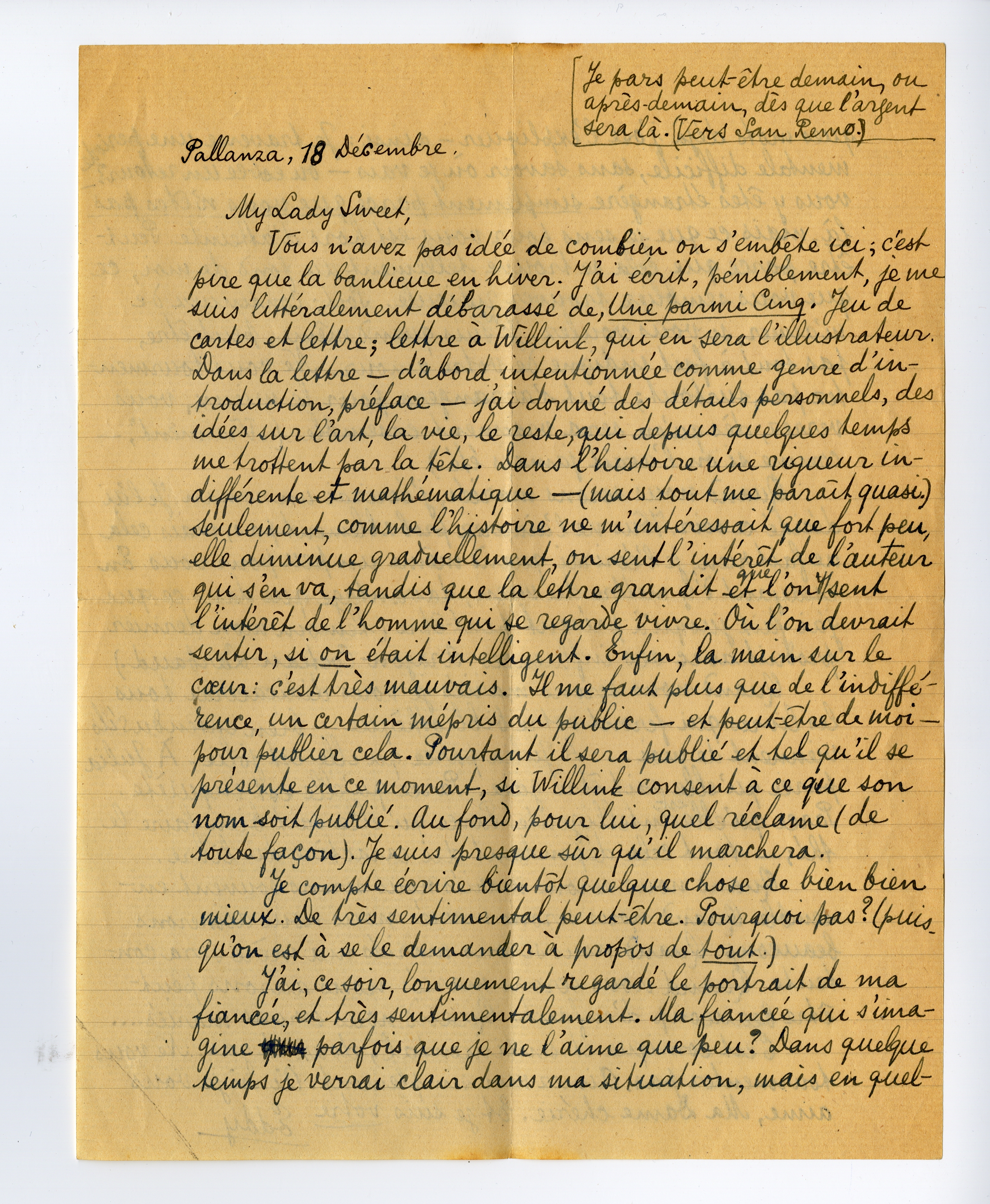 J'ai, ce soir, longuement regardé le portrait de ma fiancée, et très sentimentalement. Ma fiancée qui s'imagine parfois que je ne l'aime que peu? Dans quelque temps je verrai clair dans ma situation, mais en quelques mots déjà j'ose l'expliquer - ainsi: Je traverse une periode mentale difficile, sans savoir où je vais - ou est-ce un retour? - vous y êtes étrangère simplement parce que vous n'êtes pas là, mais ce que je sens pour vous est hors d'atteinte. Peut-être parce que cela se trouve tellement au fond de moi, ce que vous sembliez trouver ridicule. Soit; continuez de m'aimer, si vous voulez. Je ne suis quand même, peut-être, pas tout à fait indigne de votre amour. Ne vous tourmentez pas, surtout; tout s'arrangera pour le mieux, vous verrez, dès qu'on sera vraiment ensemble. (‘Vraîment’, - comme si on l'avait jamais été.)