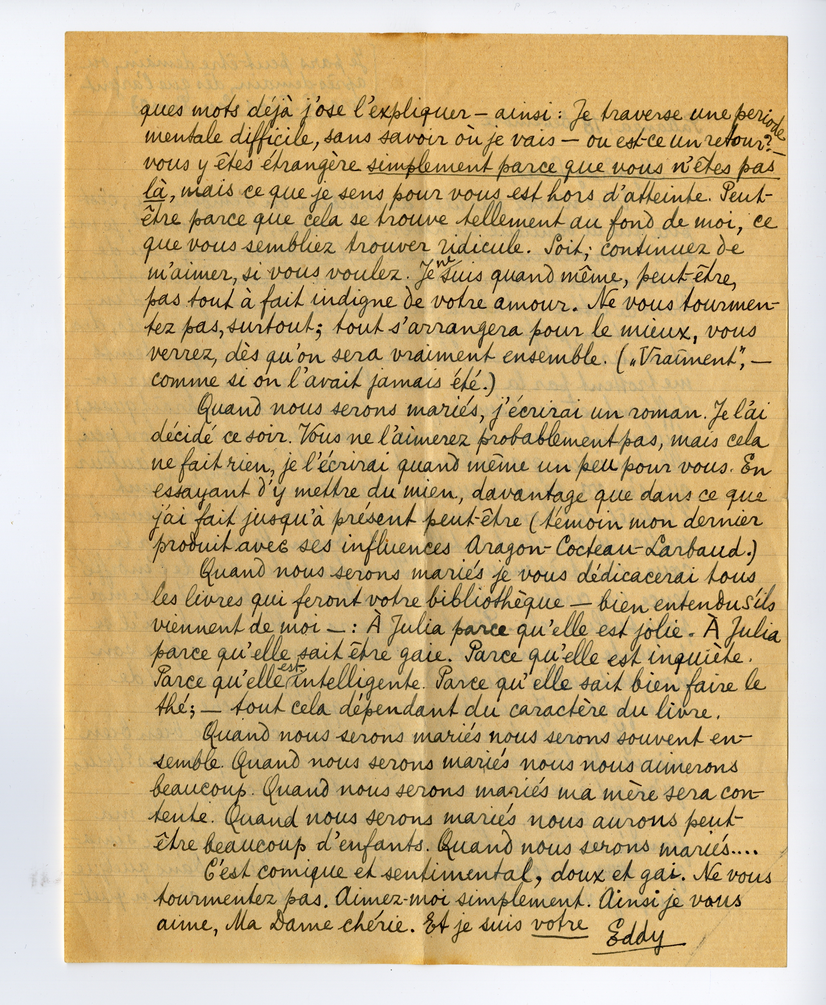 Quand nous serons mariés, j'écrirai un roman. Je l'ai décidé ce soir. Vous ne l'aimerez probablement pas, mais cela ne fait rien, je l'écrirai quand même un peu pour vous. En essayant d'y mettre du mien, davantage que dans ce que j'ai fait jusqu'à présent peut-être (témoin mon dernier produit avec ses influences Aragon-Cocteau-Larbaud.)