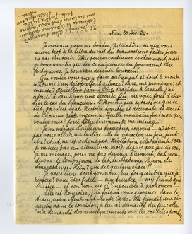 Que voulez-vous que je fasse autrement si tout le monde m'honore d'un très-parfait silence? Lire, me promener; et ensuite? Après l'Une parmi Cing, tragédie à laquelle j'ai ajouté à San Remo une seconde fin, me voici forcé d'etudier le cas du Silencieux. L'Homme qui se tait; ou qui se tût, ça m'est égal. Histoire terrible et décevante. Le secret de l'homme reste inconnu. Quelle mauvaise foi! mais que voulez-vous? forcé d'être écrivain, je me ménage.