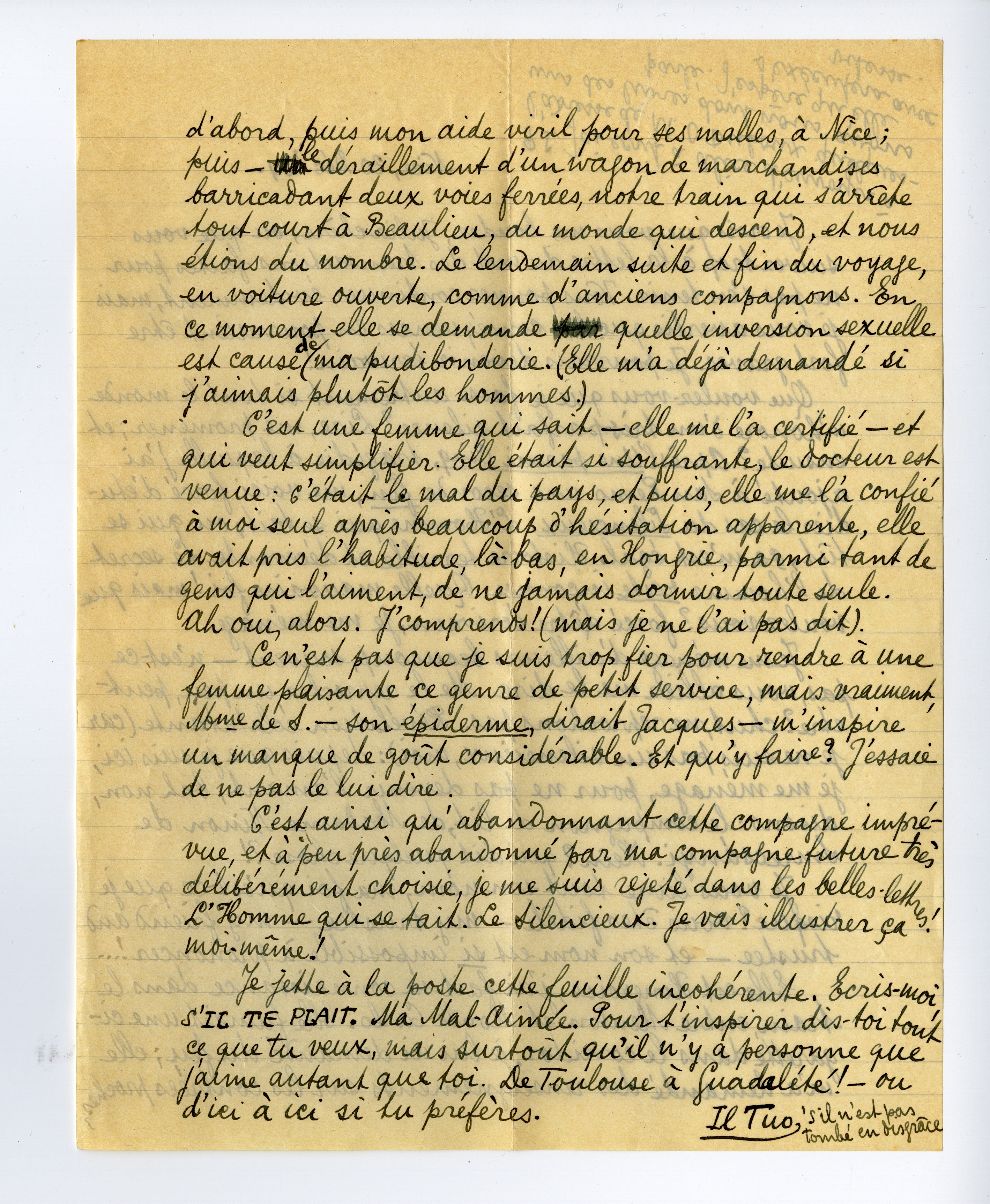 Je jette à la poste cette feuille incohérente. Ecris-moi, S'IL TE PLAIT. Ma Mal-Aimée. Pour t'inspirer dis-toi tout ce que tu veux, mais surtoût qu'il n'y a personne que j'aime autant que toi. De Toulouse à Guadalété! - ou d'ici à ici si tu préfères.
