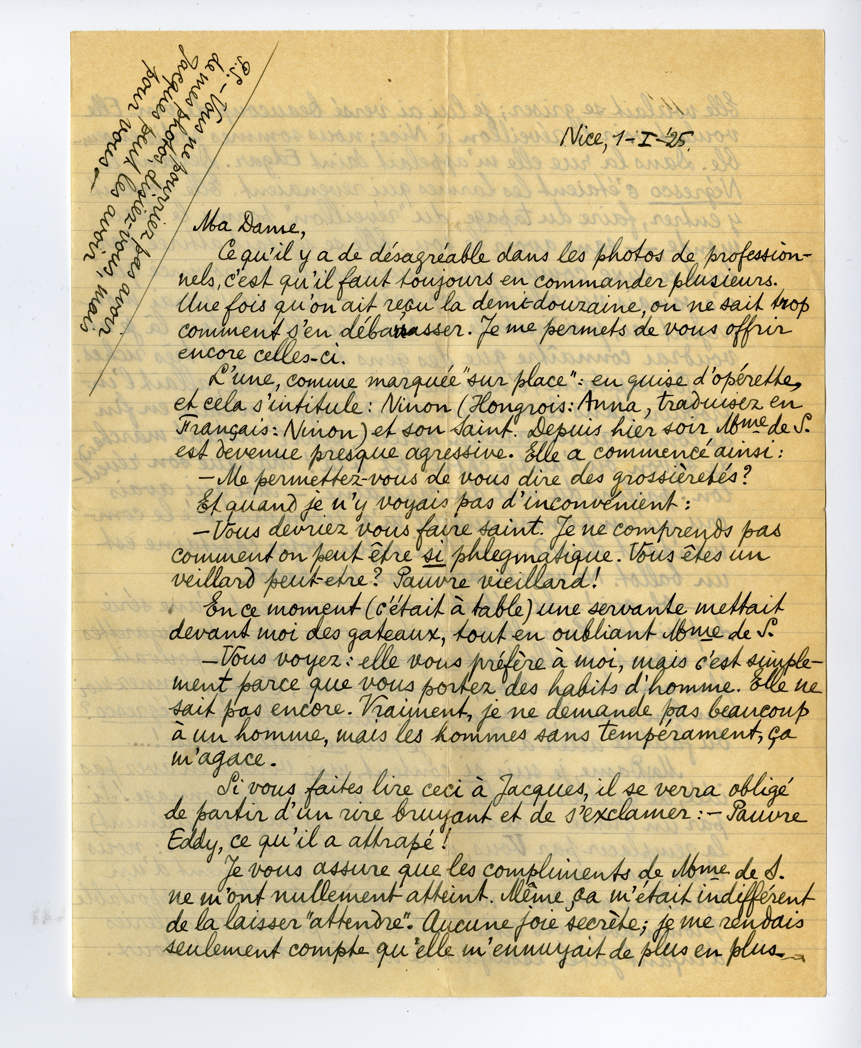 Ma Dame, je suis si content, moi, vous n'en avez pas idée, de quitter bientôt ce très-embêtant personnage! Si par un crime - de saint - j'aurais pu (mystiquement) la remplacer par Vous, je l'aurais jetée à la mer: nous deux, nous aurions su nous ficher autrement d'un réveillon mondain niçois, j'espère. Quelle insupportable promenade, avec cette femme qui par des miauleries d'enfant gâtée essayait de me tirez des mots doux.