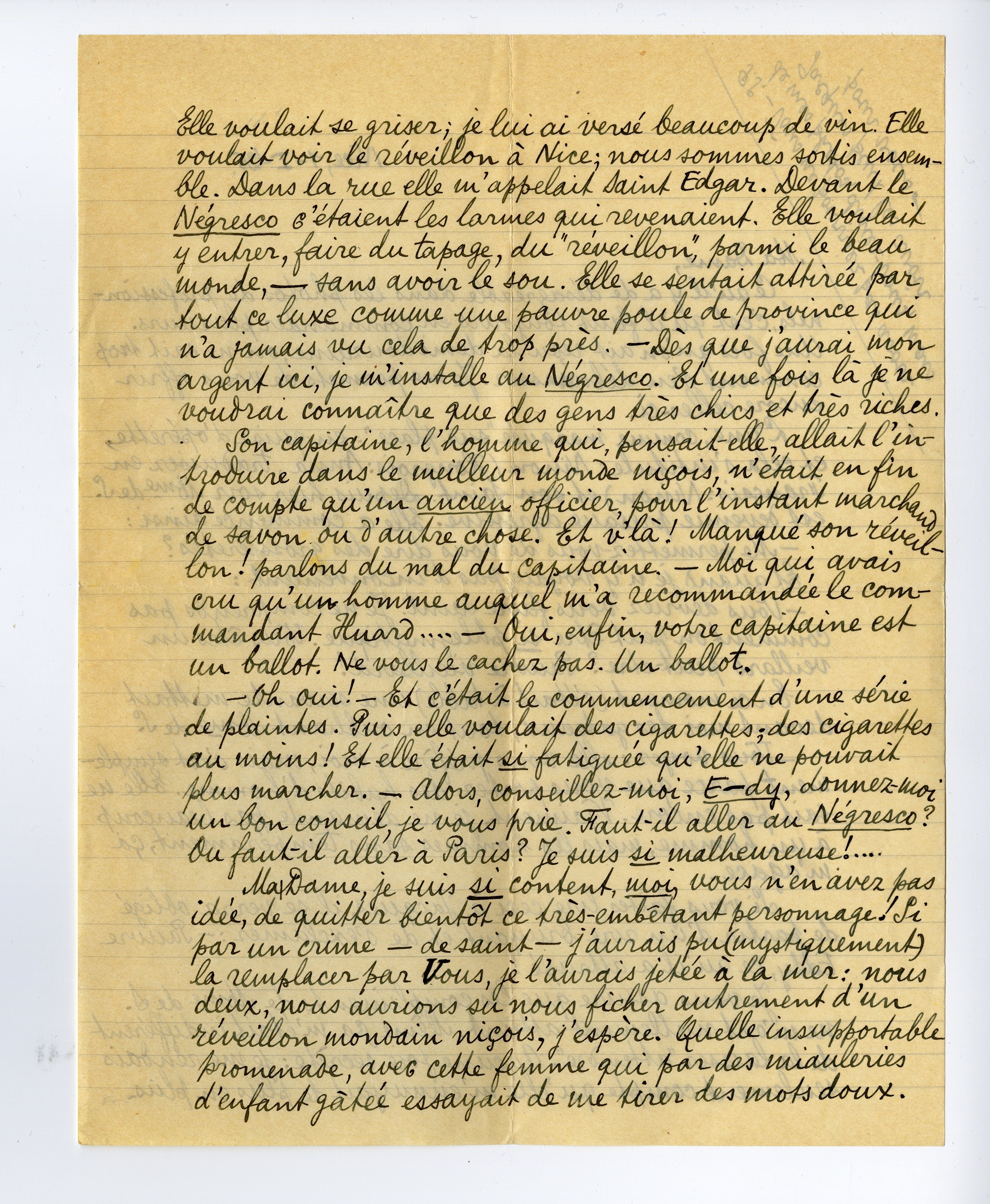 Je vous assure que les compliments de Mme de S. ne m'ont nullement atteint. Même ça m'était indifférent de la laisser ‘attendre’. Aucune joie secrète; je me rendais seulement compte qu'elle m'ennuyait de plus en plus. Elle voulait se griser; je lui ai versé beaucoup de vin. Elle voulait voir le réveillon à Nice; nous sommes sortis ensemble. Dans la rue elle m'appelait Saint Edgar. Devant le Négresco c'étaient les larmes qui revenaient. Elle voulait y entrer, faire du tapage, du ‘réveillon’, parmi le beau monde, - sans avoir le sou. Elle se sentait attirée par tout ce luxe comme une pauvre poule de province qui n'a jamais vu cela de trop près. - Dès que j'aurai mon argent ici, je m'installe au Négresco. Et une fois là je ne voudrai connaître que des gens très chics et très riches.