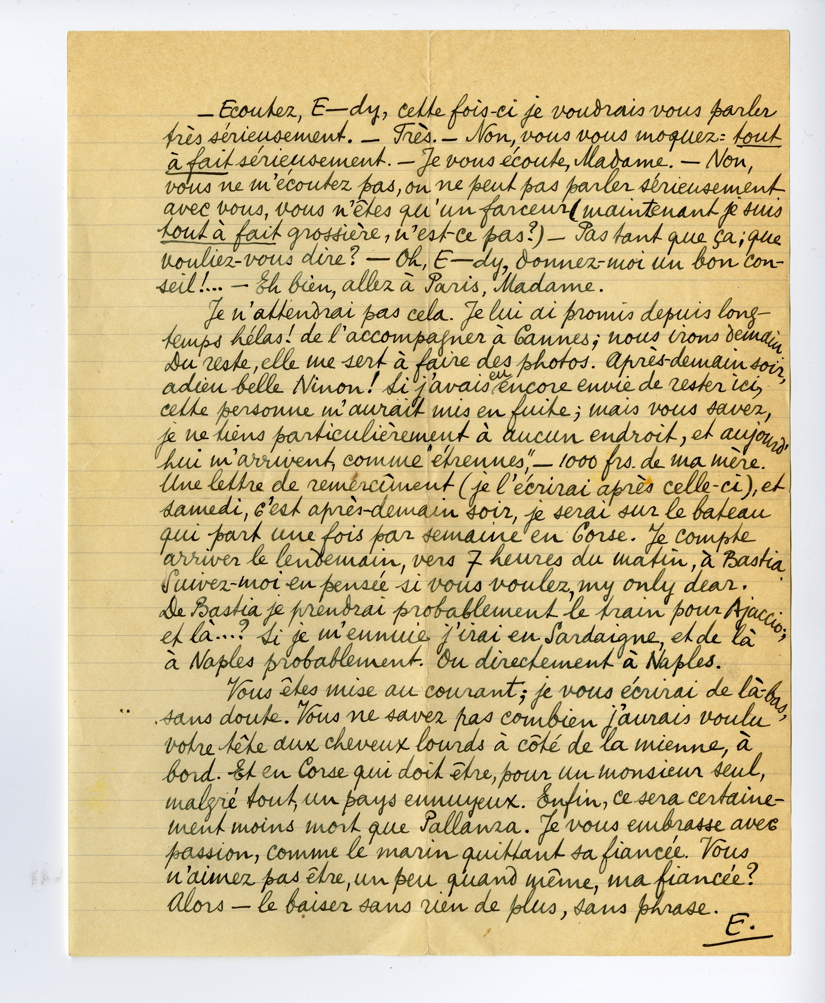 Vous êtes mise au courant; je vous écrirai de là-bas, sans doute. Vous ne savez pas combien j'aurais voulu votre tête aux cheveux lourds à côté de la mienne, à bord. Et en Corse qui doit être, pour un monsieur seul, malgré tout, un pays ennuyeux. Enfin, ce sera certainement moins mort que Pallanza. Je vous embrasse avec passion, comme le marin quittant sa fiancée. Vous n'aimez pas être, un peu quand même, ma fiancée? Alors - le baiser sans rien de plus, sans phrase.