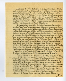 - Ecoutez, E-dy, cette fois-ci je voudrais vous parler très sérieusement. - Très. - Non, vous vous moquez: tout à fait sérieusement. - Je vous écoute, Madame. - Non, vous ne m'écoutez pas, on ne peut pas parler sérieusement avec vous, vous n'êtes qu'un farceur (maintenant je suis tout à fait grossière, n'est-ce pas?) - Pas tant que ça; que vouliez-vous dire? - Oh, E-dy, donnez-moi un bon conseil!.... - Eh bien, allez à Paris, Madame.