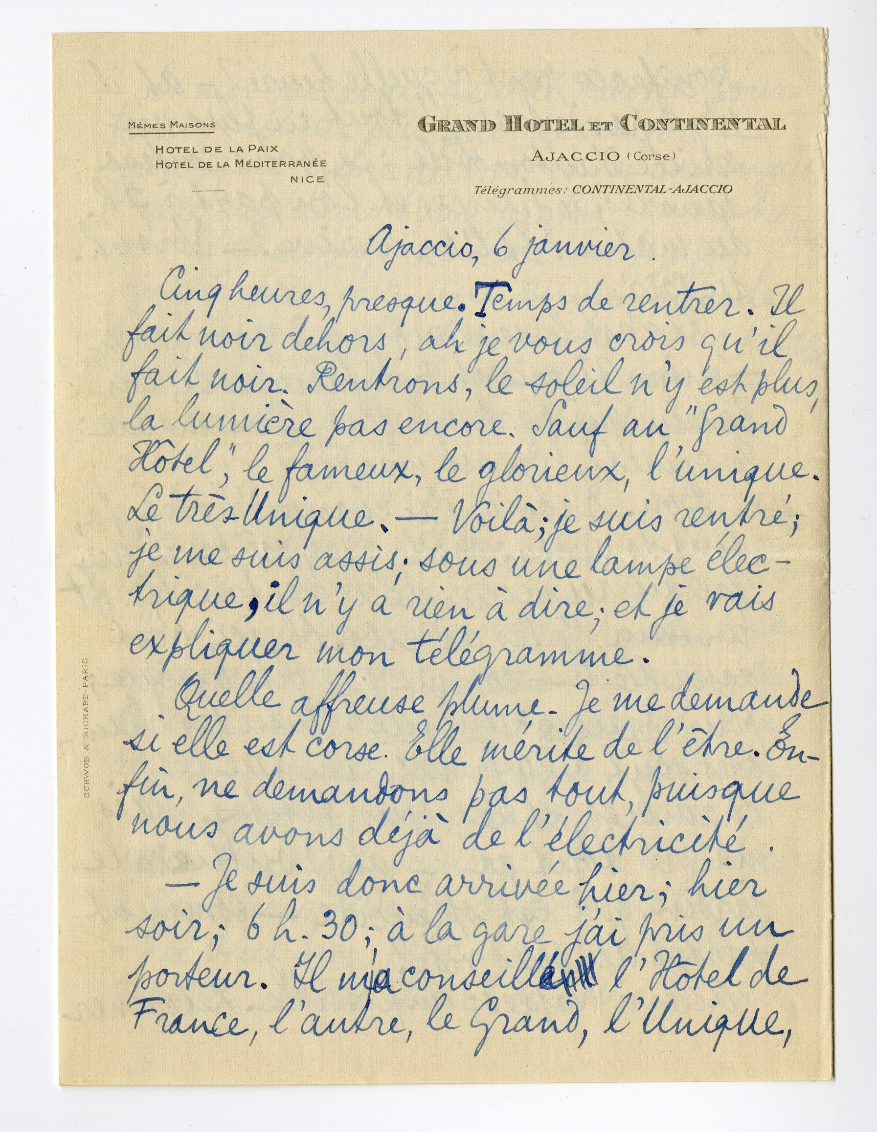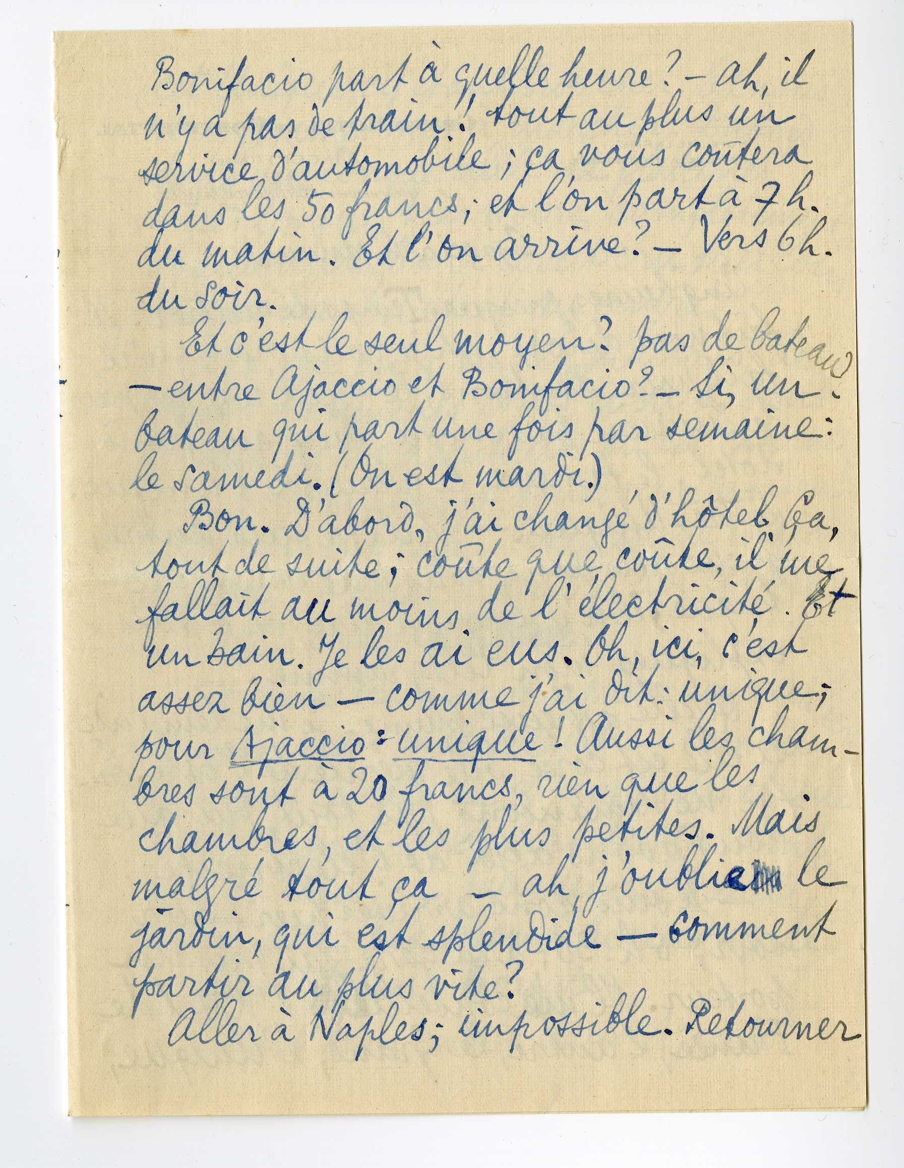 Bon. D'abord, j'ai changé d'hôtel Ça, tout de suite; coûte que coûte, il me fallait au moins de l'électricité. Et un bain. Je les ai eus. Oh, ici, c'est assez bien - comme j'ai dit: unique; pour Ajaccio: unique! Aussi les chambres sont à 20 francs, rien que les chambres, et les plus petites. Mais malgré tout ça - ah, j'oublie le jardin, qui est splendide - comment partir au plus vite?